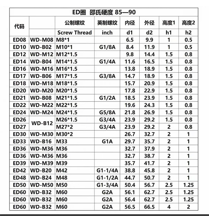 仕様とモデル ディンチン ED8 (6.5*9.9*1),ディンチン ED10 (8.4*11.9*1),ディンチン ED14 11.6*16.5*1.5,ディンチン ED16 13.8*18.9*1.5,ディンチン ED17 14.7*18.9*1.5,ディンチン ED18 15.7*20.9*1.5,ディンチン ED20 17.8*22.9*1.5,ディンチン ED21 18.5*23.9*1.5,ディンチン ED22 19.6*24.3*1.5,ディンチン ED24 21.8*26.9*1.5,ディンチン ED26 23.9*29.2*1.5,ディンチン ED27 23.9*29.2*2,ディンチン ED33 (29.7*35.7*2),ディンチン ED42 (38.8*45.8*2),ディンチン ED48(44.7*50.7*2),ディンチン ED60 (56.5*66.5*4)