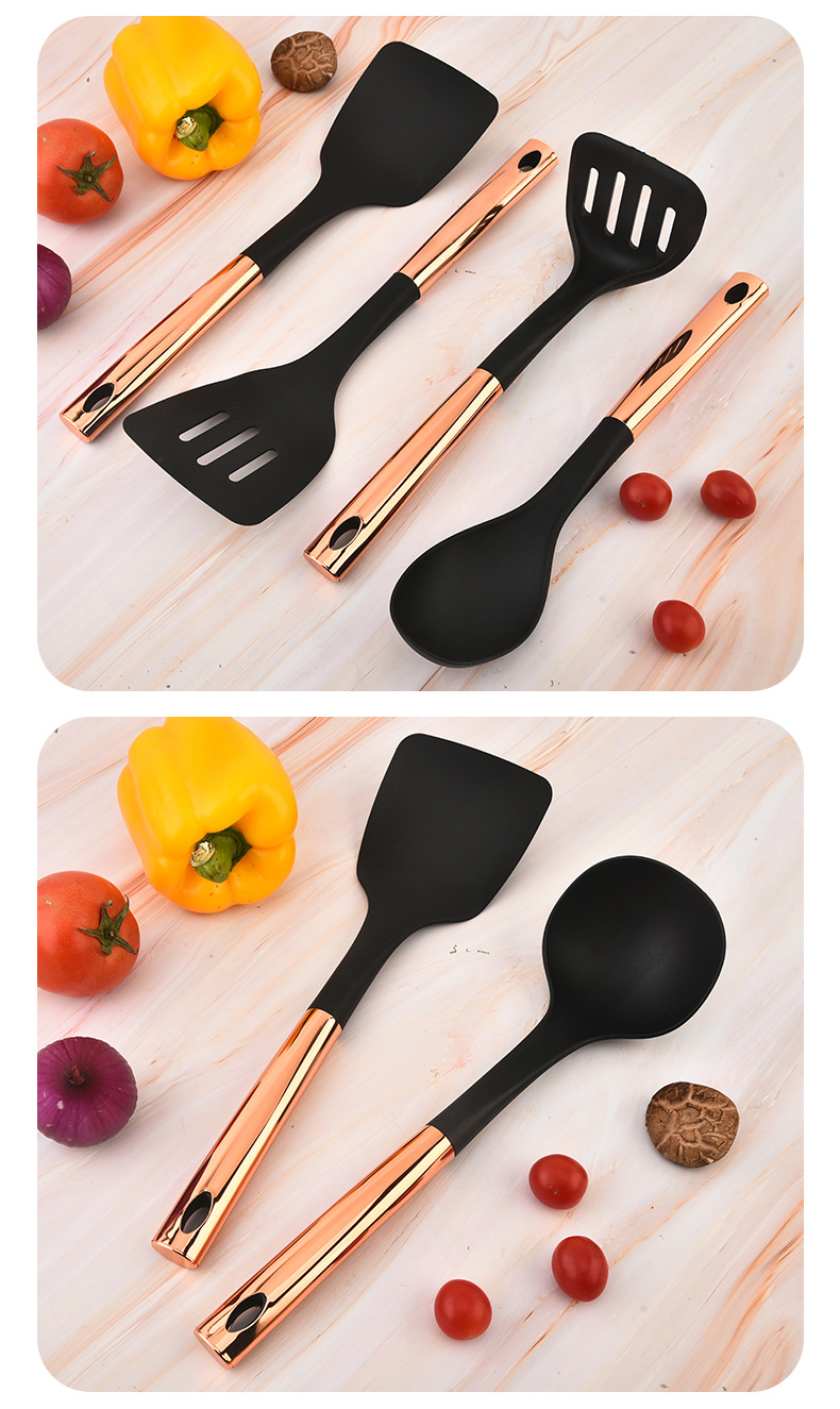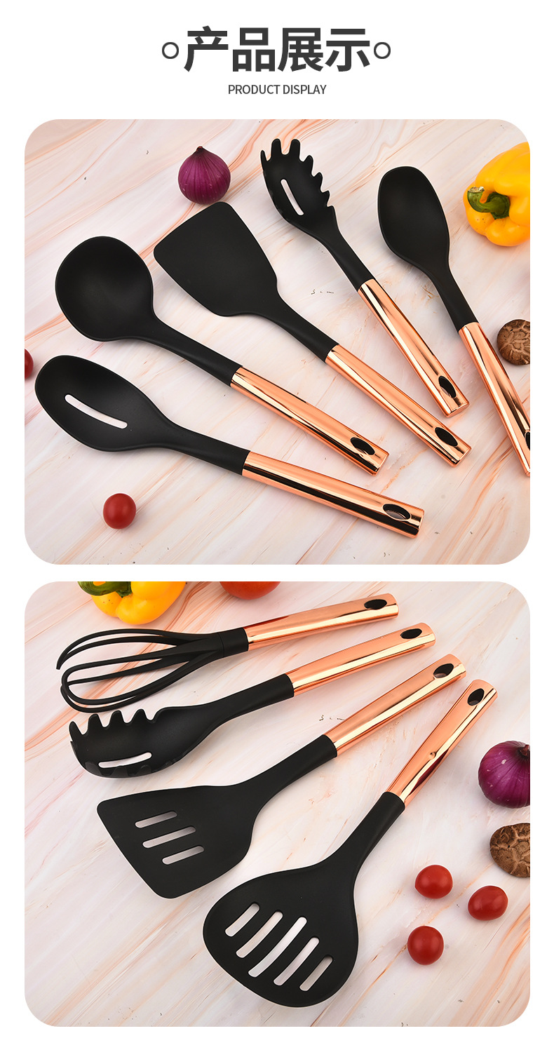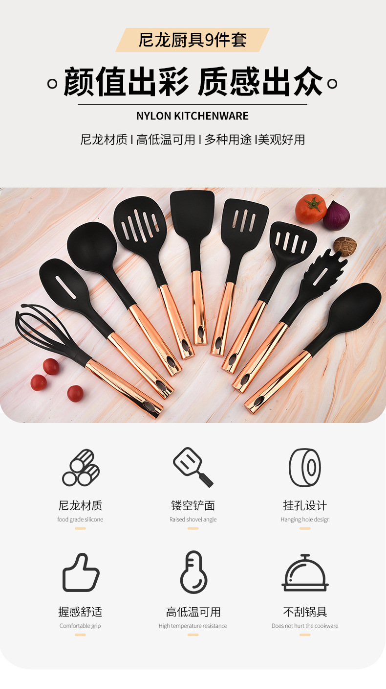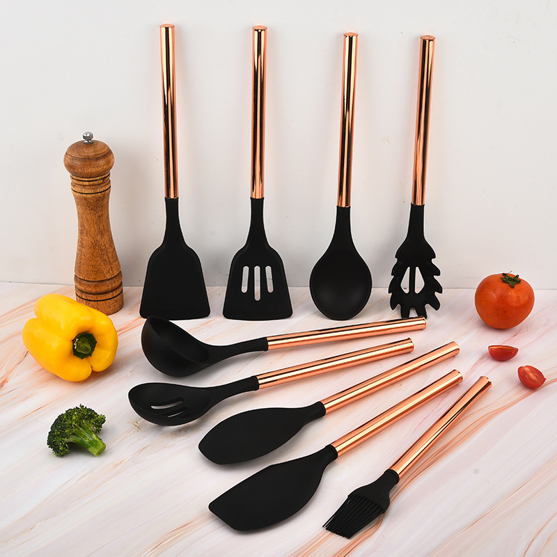 シリコン料理道具9点セットステンレスバラ金柄炒め物シャベルスプーンキッチン料理シャベルスプーンセット卸売り