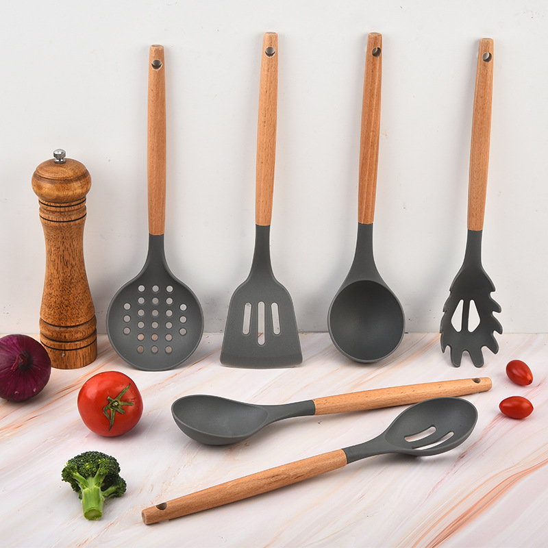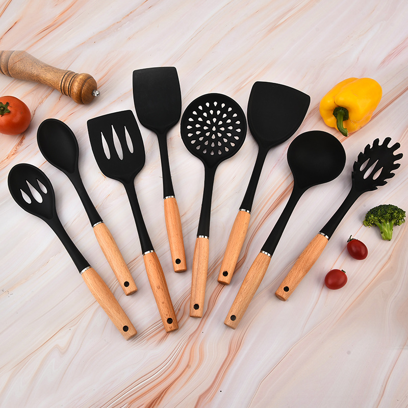 木の柄のシリカゲルの調理器具セット8点セット家庭用調理鍋のスプーンの台所のシリカゲルの調理器具のスプーンセット