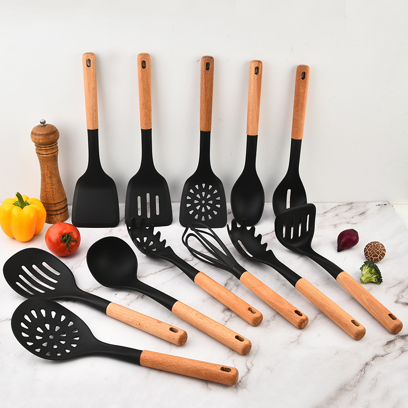 新しい木の柄のプラスチックのナイロンの調理器具のセットは鍋の専用の鍋のシャベルのスプーンの12セットの台所の調理用品にくっつきません。