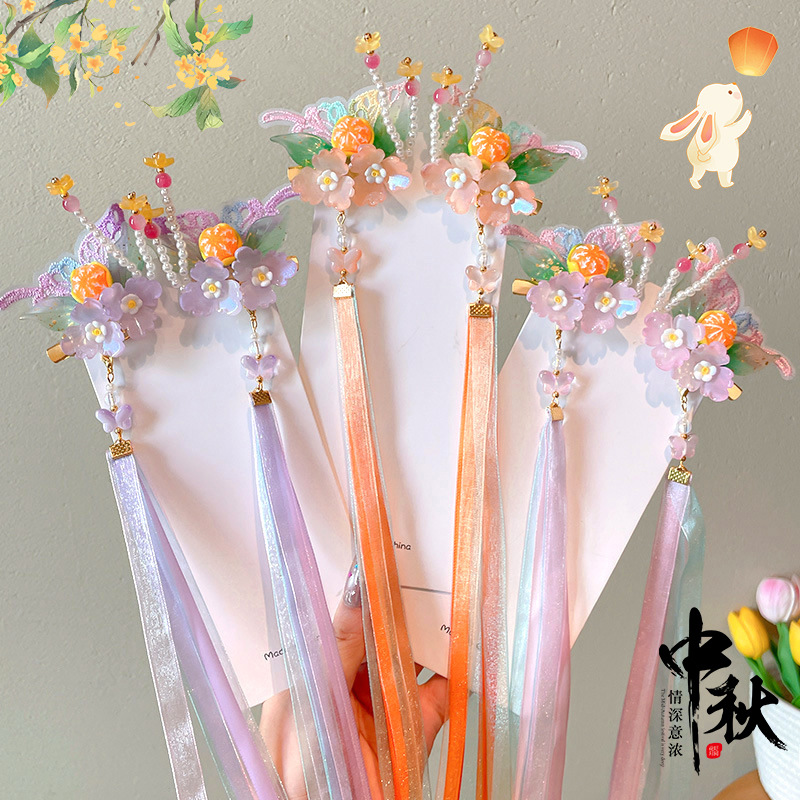 女童古装汉服发夹儿童蝴蝶花朵发卡古风步摇流苏飘带头饰女孩发饰