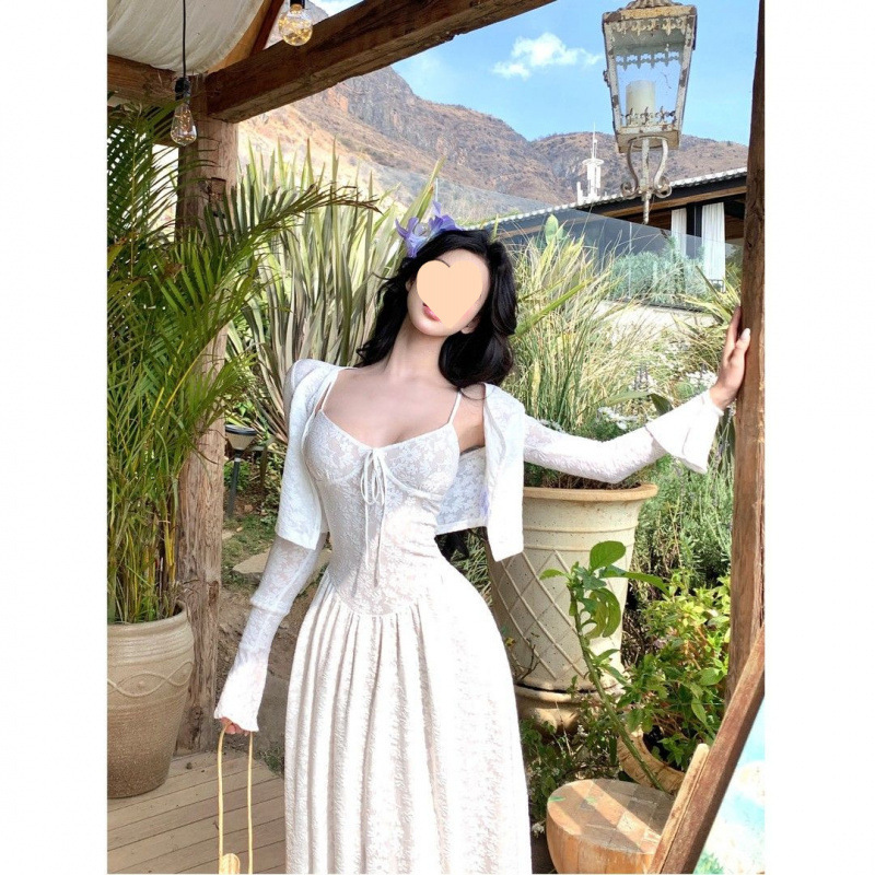 フレンチサスペンダードレス女性のための 2025 春の新白ジャカードカーディガンロングスカートスーツ休暇ウエストスカート