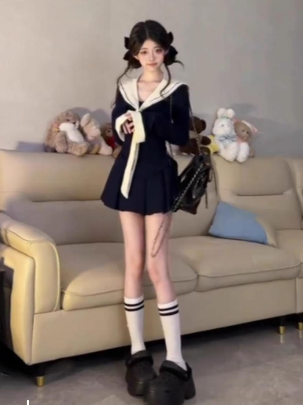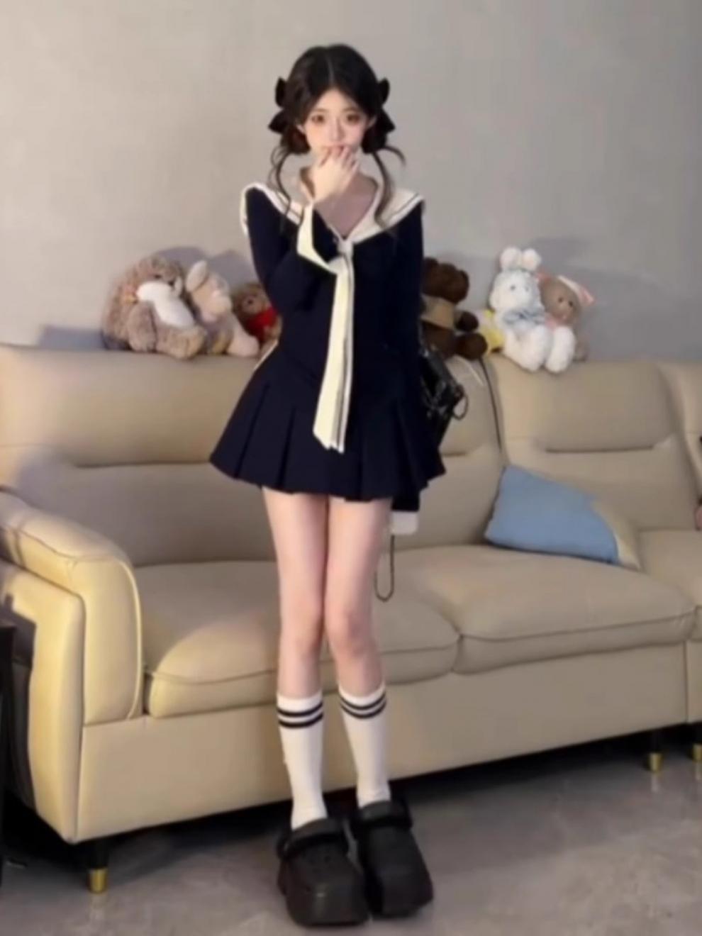 学院风辣妹套装女夏新款海军领T恤上衣高腰显瘦百褶短裙两件套女