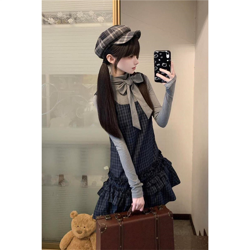 少女心事 秋装新款日系古早vintage设计蝴蝶结上衣格纹连衣裙套装