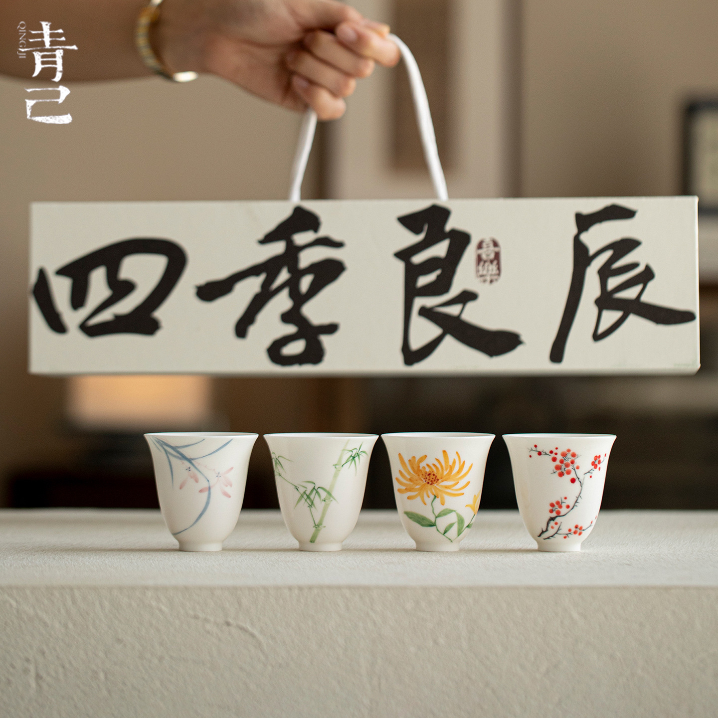 墨己国风手绘梅兰竹菊茶杯礼盒装品茗杯四只装伴手礼送长辈杯子
