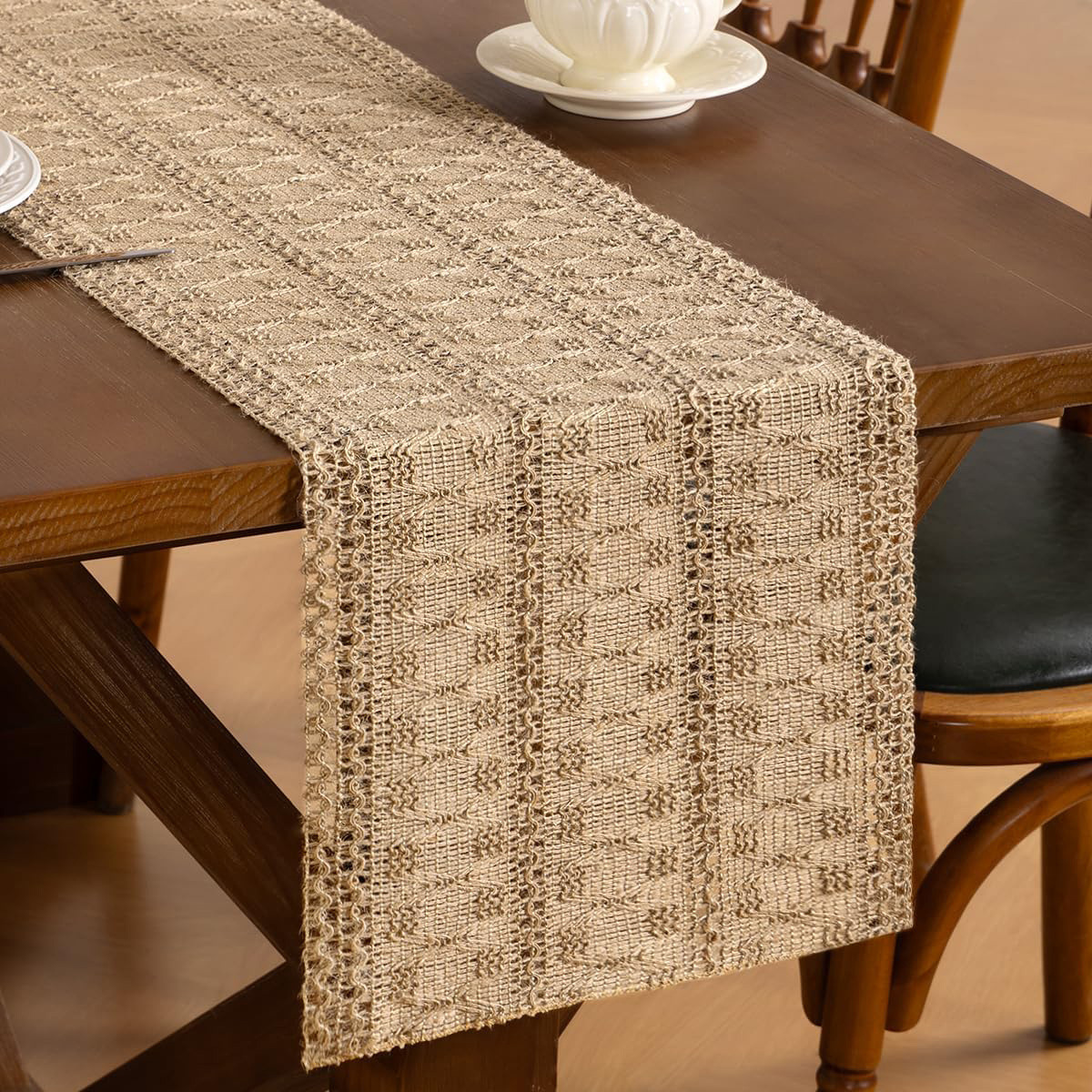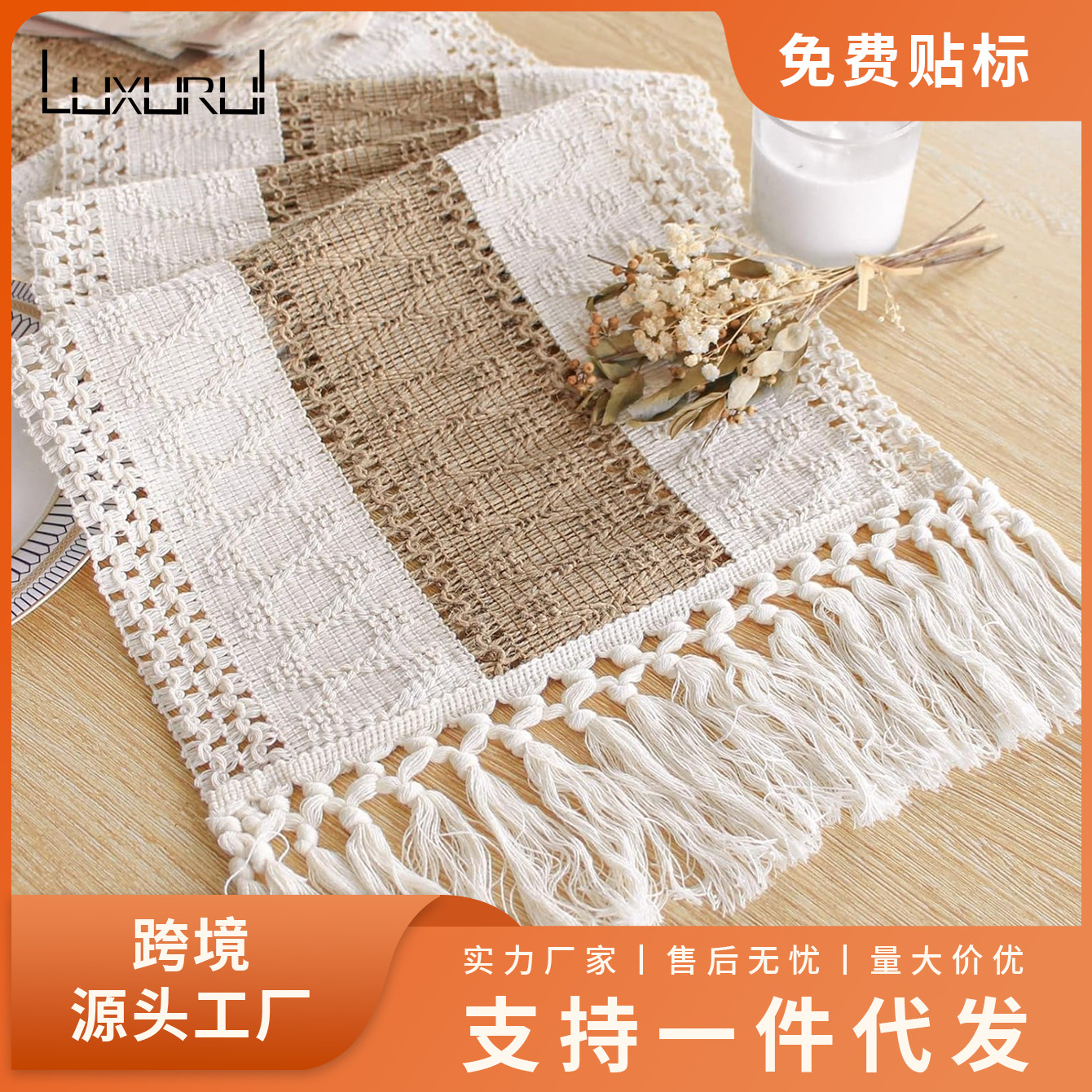 跨境桌旗亚马逊temu粗麻布桌旗黄麻钩针编织桌旗餐桌装饰外贸代发