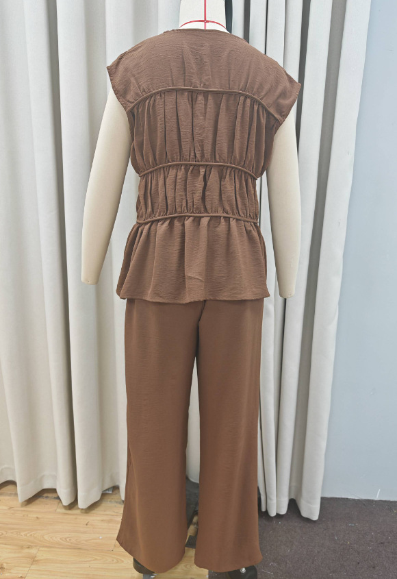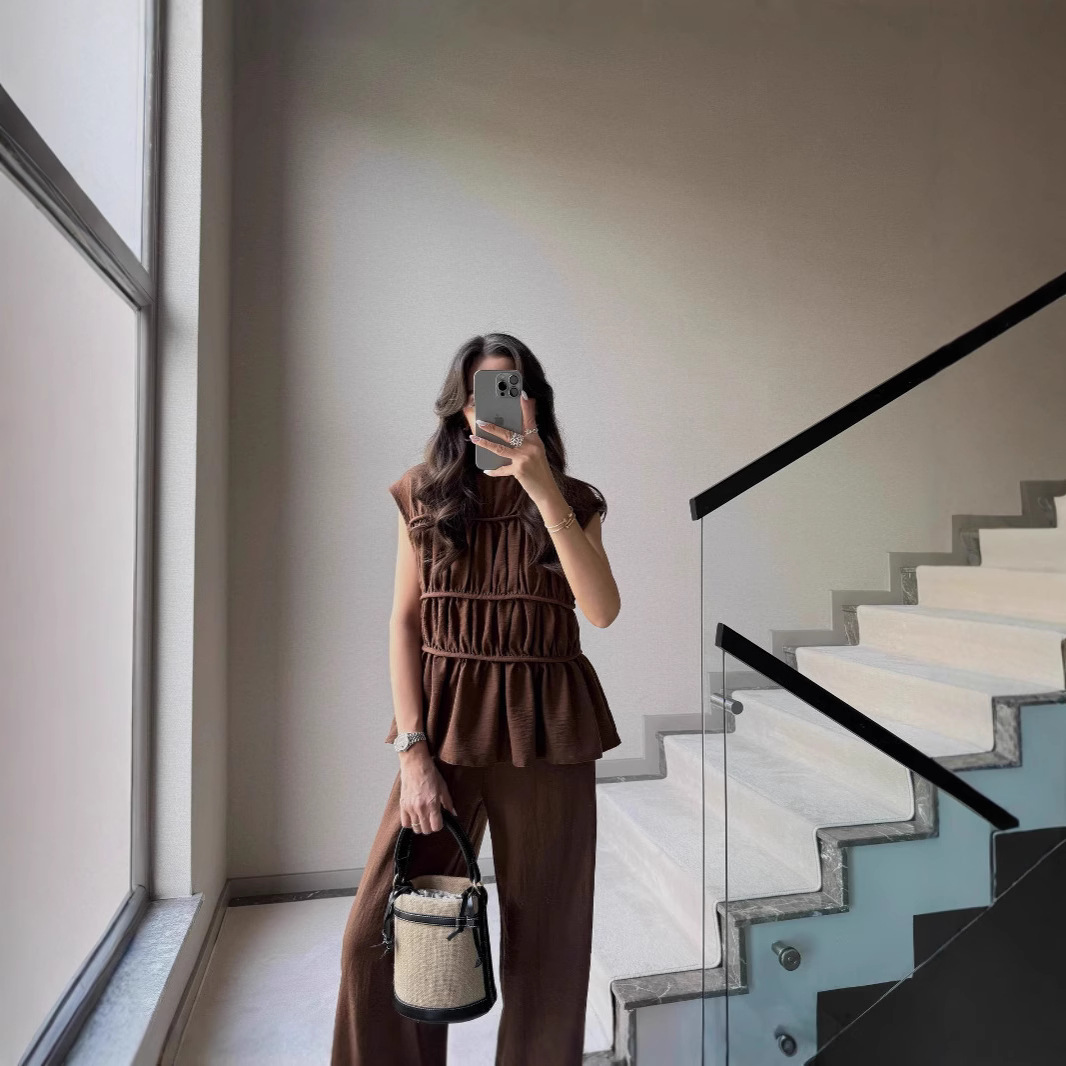 ヨーロッパとアメリカの貿易クロスボーダー 2025 AliExpress 新しい無地ノースリーブプリーツ弾性ウエストトップワイドレッグスーツ