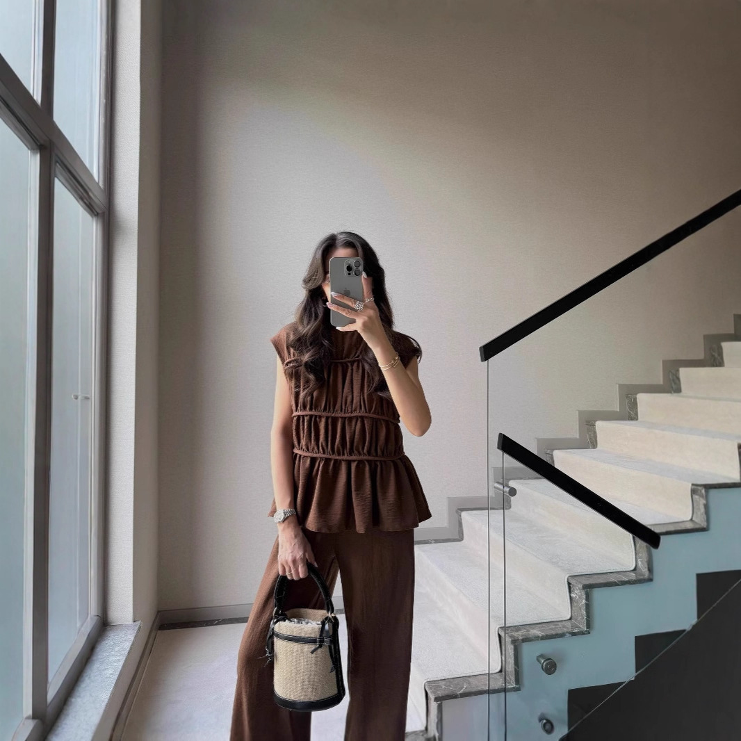气质休闲风纯色无袖褶皱松紧腰上衣阔裤腿套装2025跨境欧美新款