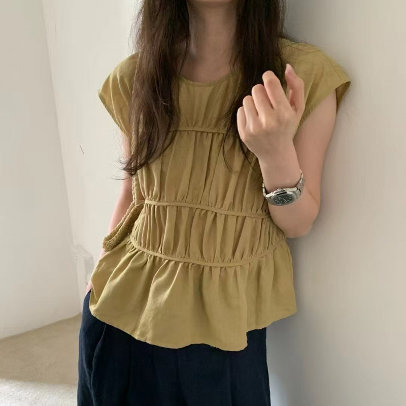 韩国东大门甜美气质纯色褶皱圆领百搭设计无袖套头衬衫上衣女