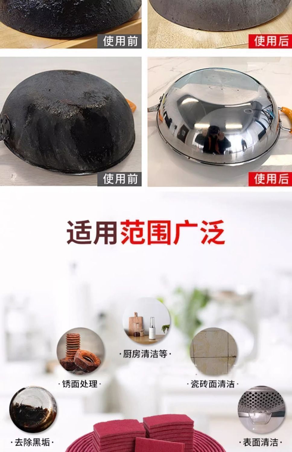 鍋の錆取り加工品、増粘・強化エメリー工業用たわし、研磨・錆取り・鍋底拭き、神火塗料シール