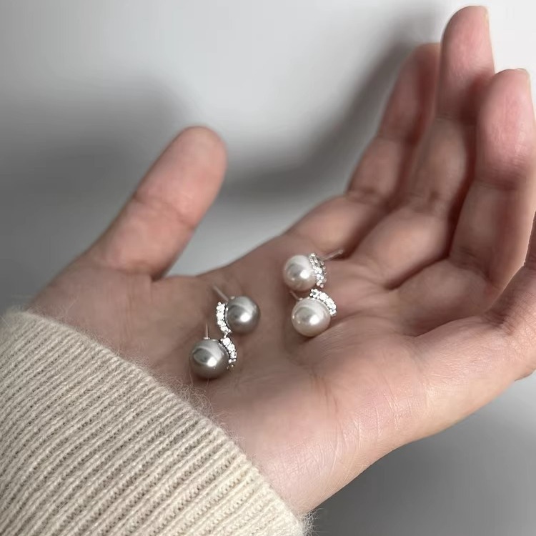 洗練されたジルコン銀灰/マカオ白色施家真珠ピアス通体純銀強光気質百合ピアス