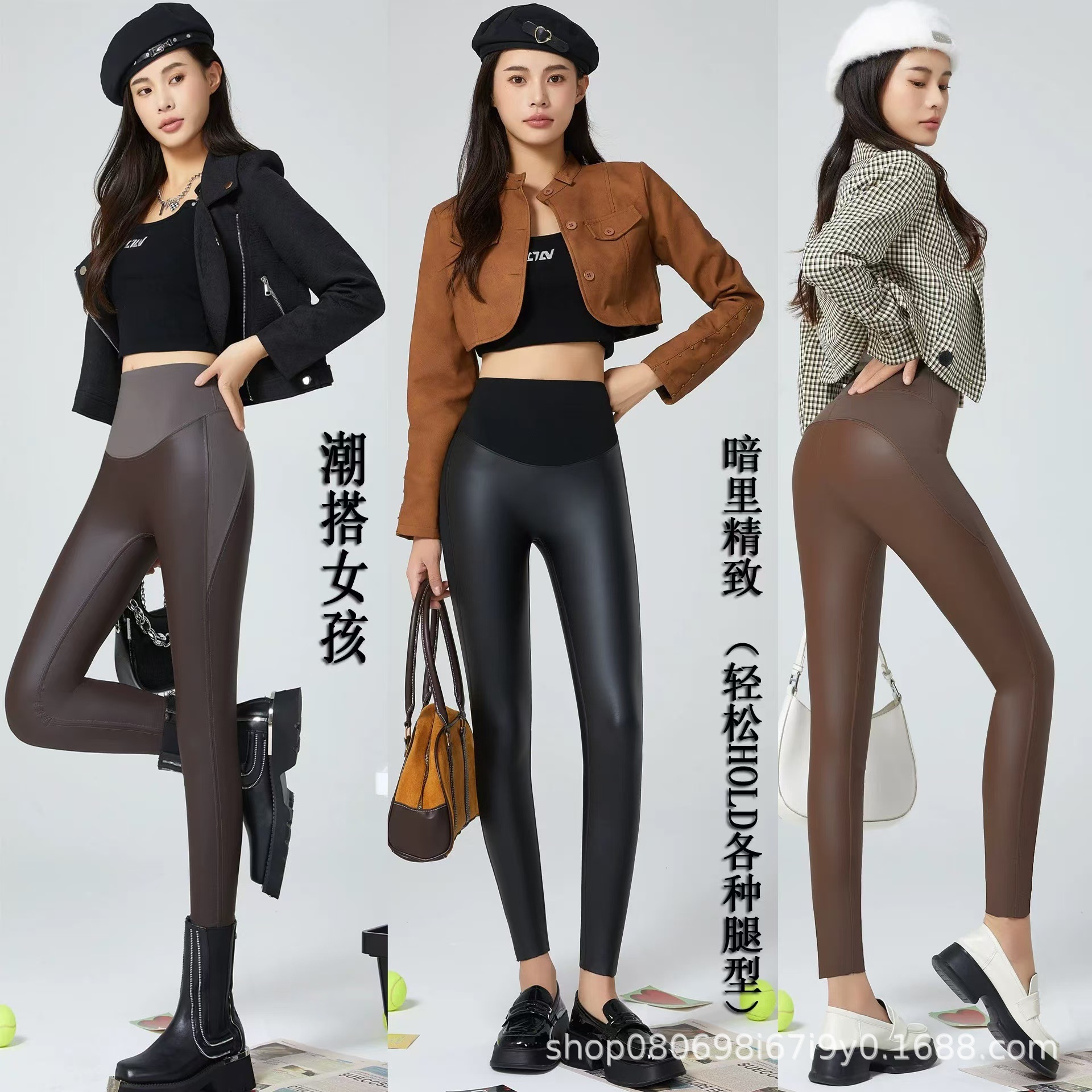 革ズボンの女性は秋冬にベルベットを着て腰の高いレギンスを厚くして痩せている防風防水足pu長ズボンを着ている