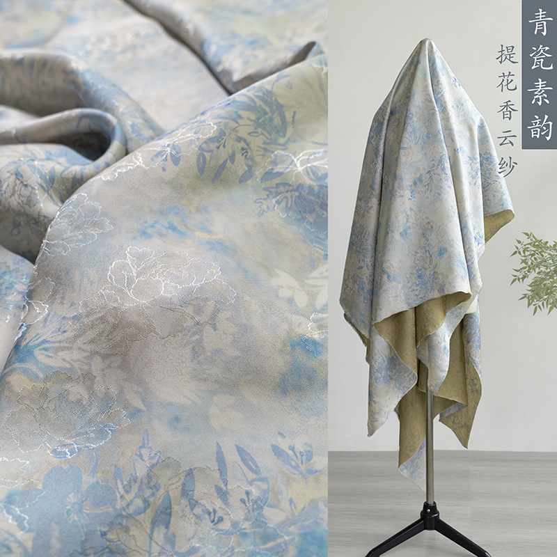 重磅新中式薯莨花萝人丝提花布料水蓝色旗袍外套连衣裙裤服装面料