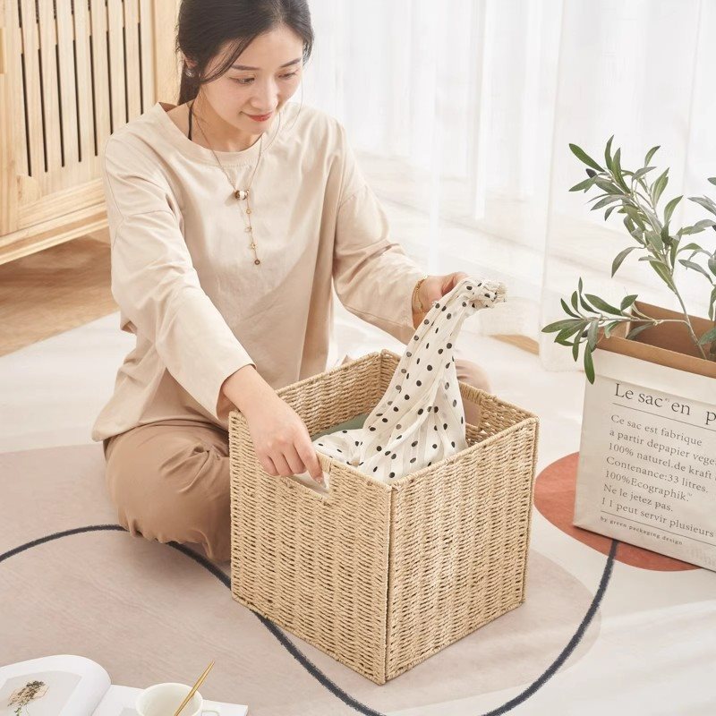 クリエイティブな草と籐の編まれた収納バスケット折りたたみ式シンプルな汚れた衣類収納バスケット正方形のおもちゃスナック収納バスケット