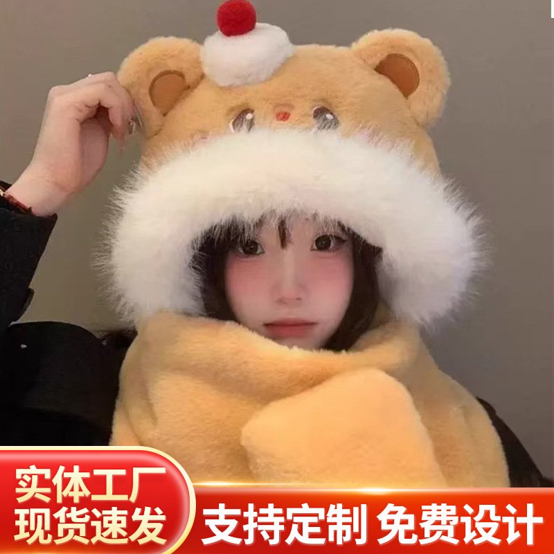 2025新款可爱蛋糕小熊毛绒帽子围巾一体显脸防寒保暖护耳雷锋帽