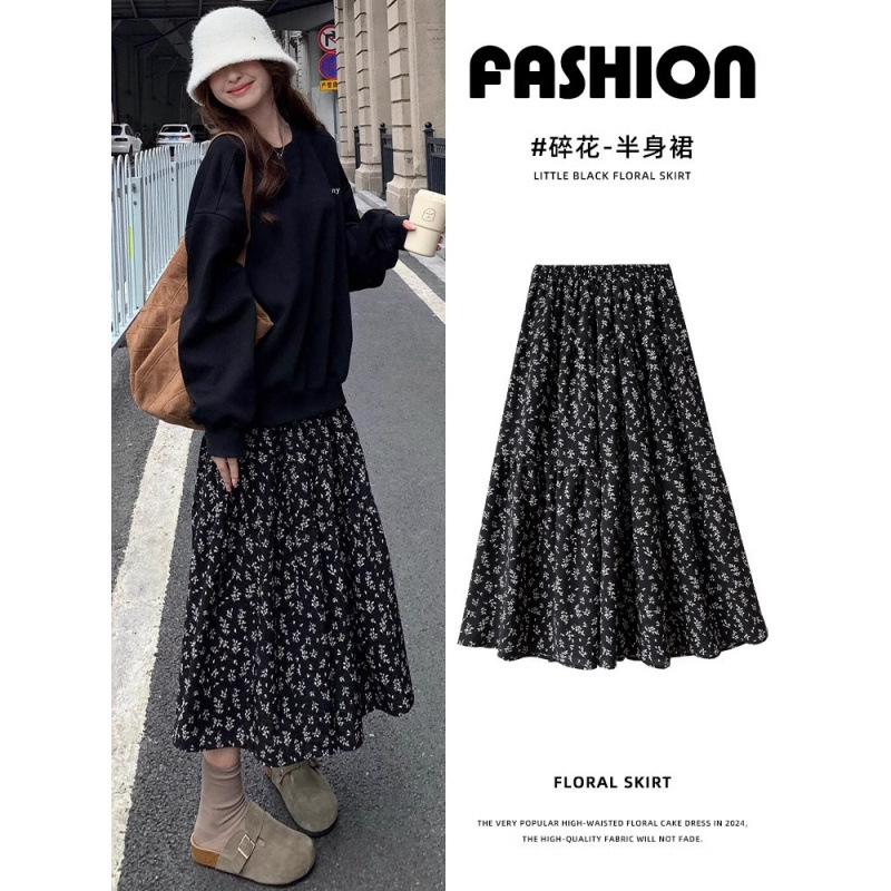 黒の花柄スカート レディース 春秋 2025年新作 ハイウエスト 細見え Aラインスカート 小柄さん向け ケーキスカート ロングスカート