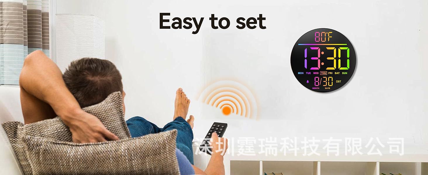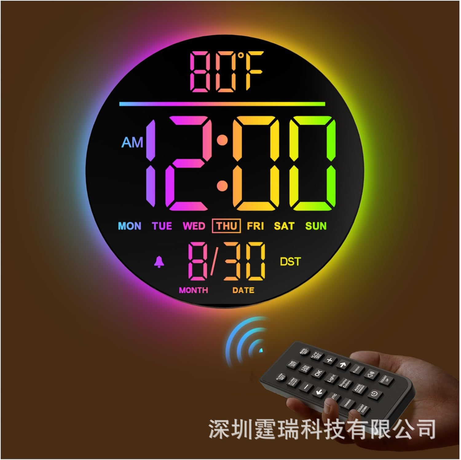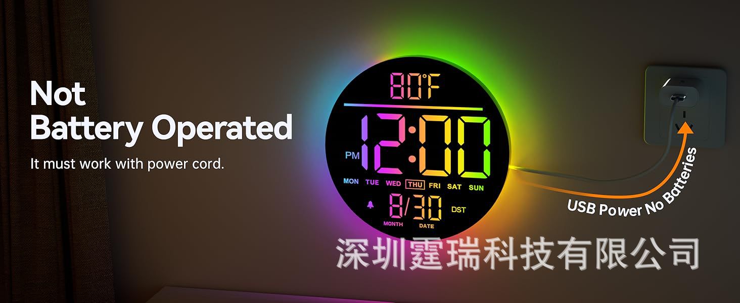 亚马逊热销款16寸大LED型RGB数字壁挂式时钟可远程遥控夜灯和闹钟