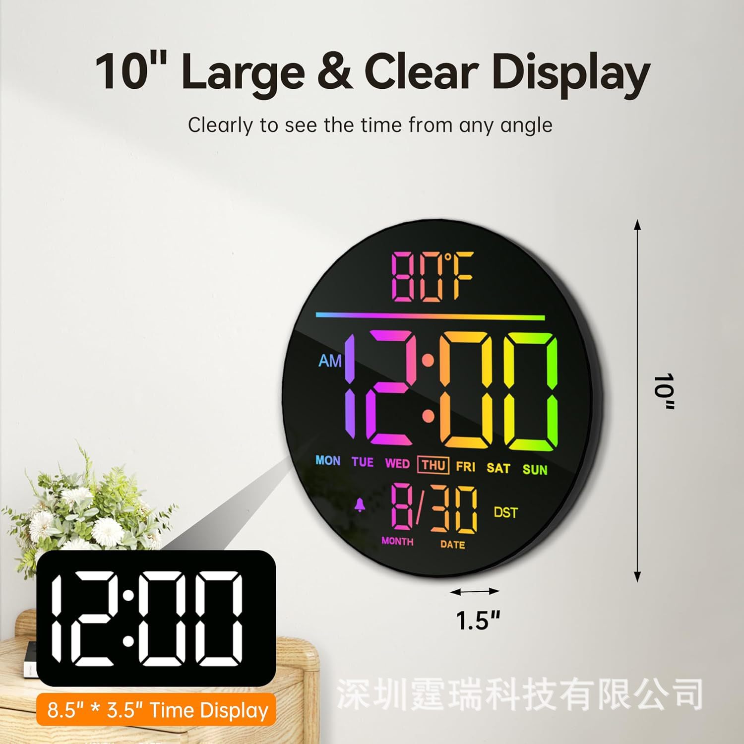 10 英寸屏幕大型数字挂钟带定时器调光器LED显示屏8种炫彩色闹钟