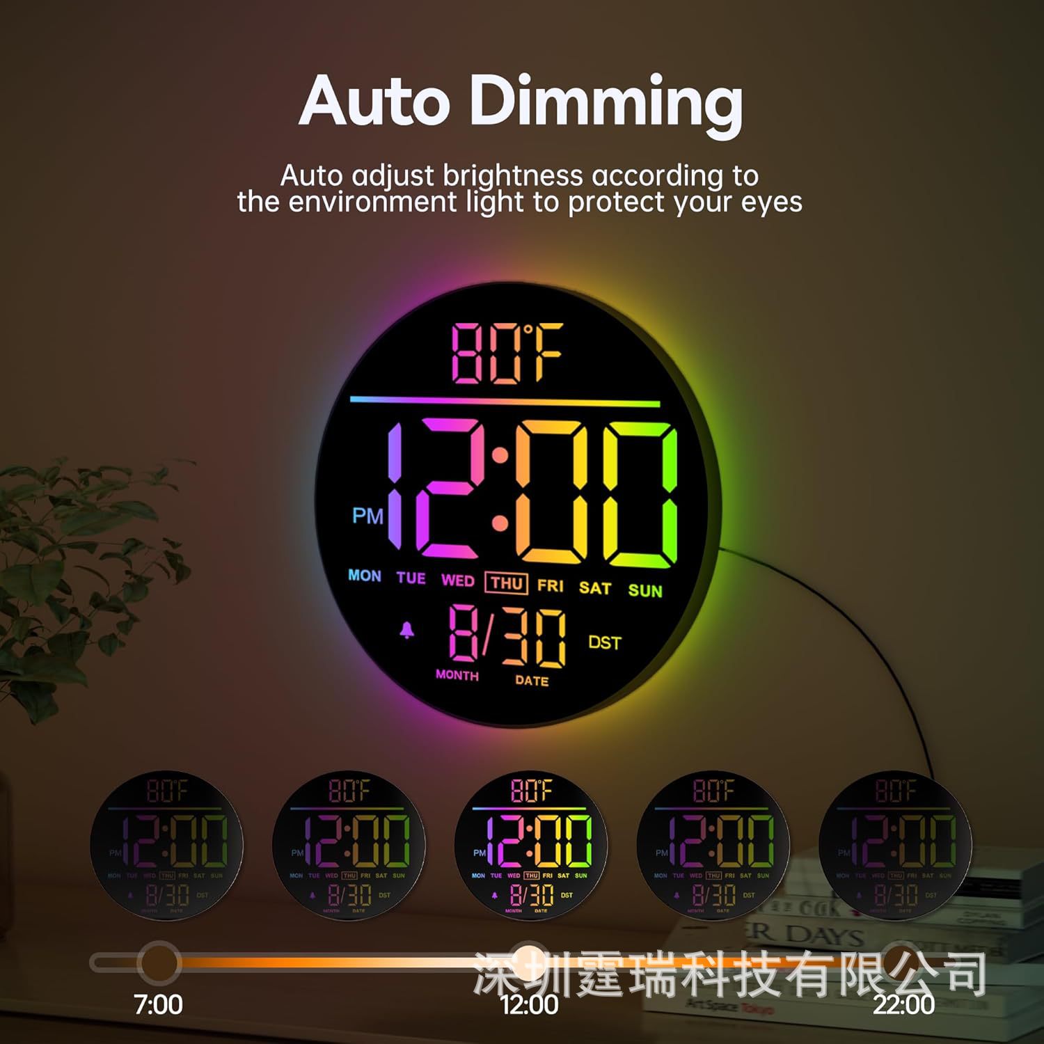 国境を越えたLED新製品、カラフルなデジタルサイレント壁掛け時計、大きなディスプレイ、雰囲気がいっぱい、内蔵の暖かい常夜灯