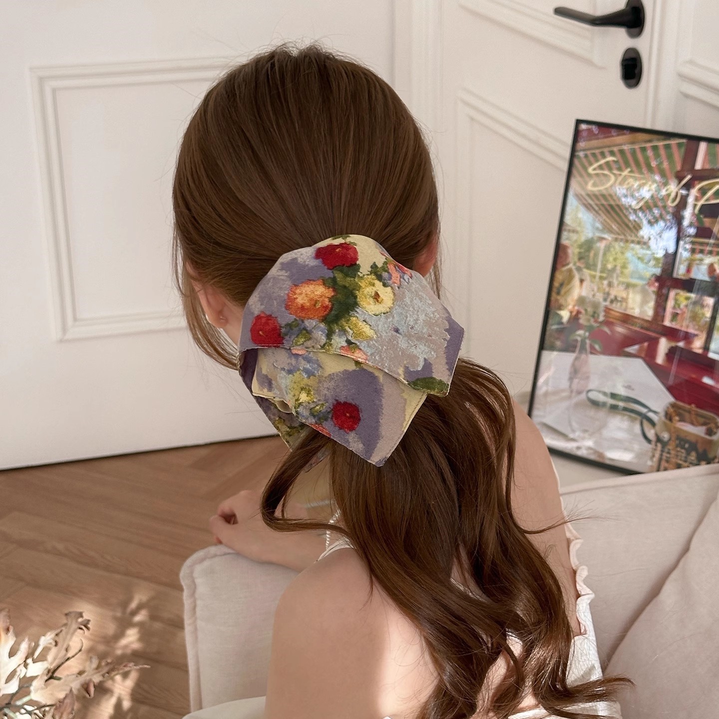 油絵風スクエアスカーフ、女性用ヘアゴム、ポニーテールヘアロープ、夏用高級レイジースタイルヘアロープヘアアクセサリー