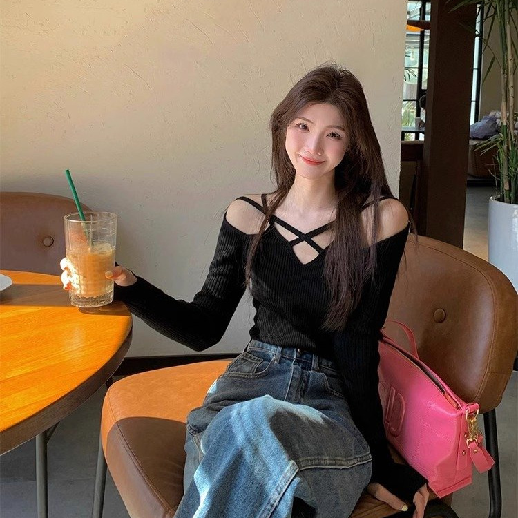 修身露肩长袖春季辣妹针织t恤女纯欲风设计2025小心机小众感打底