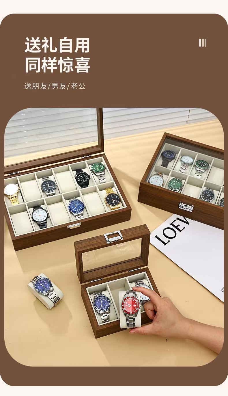 胡桃木纹手表盒收纳盒玻璃天窗木质家用储藏展示盒多位手表收藏盒