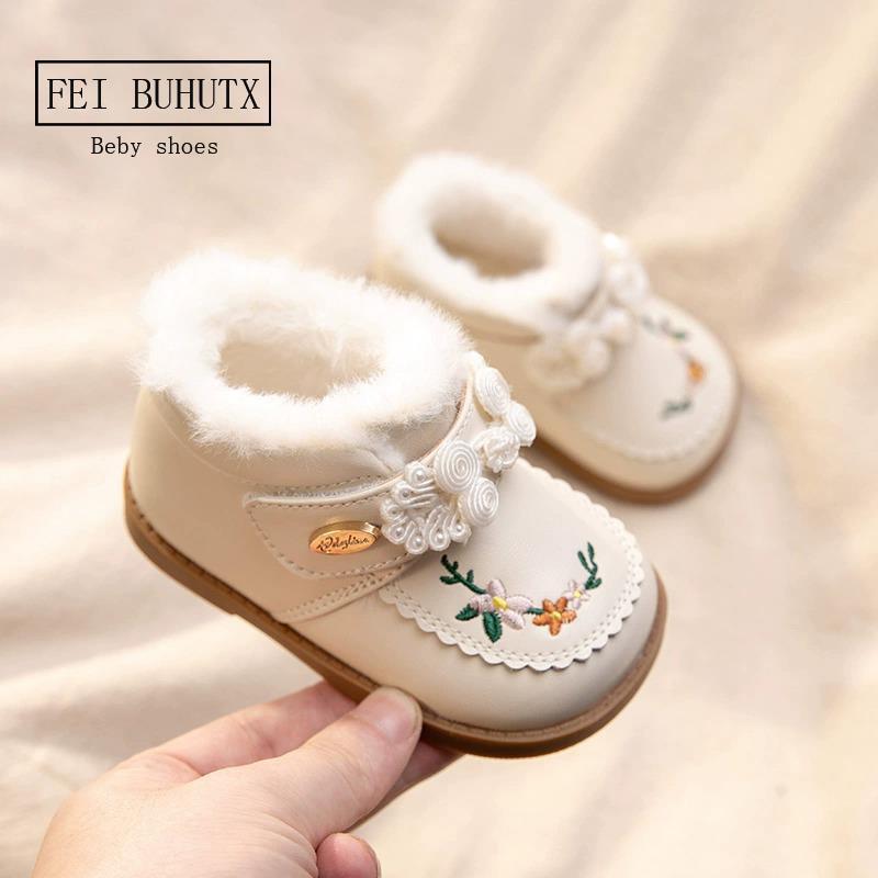 女の赤ちゃんの綿の靴、冬のベルベットのレザーブーツ、柔らかい底の子供用中国風の刺繍入り女の子のショートブーツ、漢服の靴、プリンセスシューズ