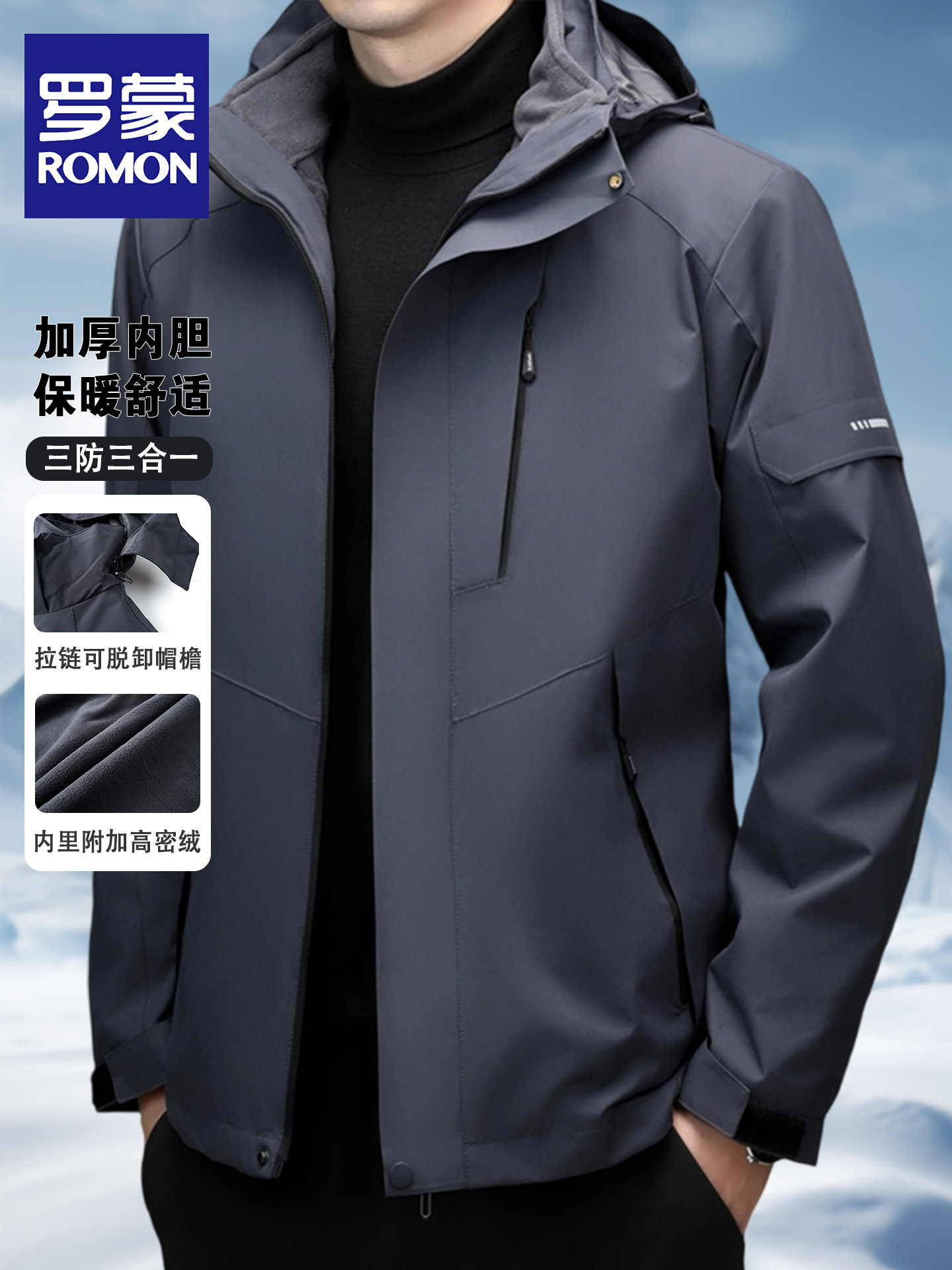 罗蒙冲锋衣外套男三合一可拆卸秋冬季加绒加厚户外防风登山服夹克