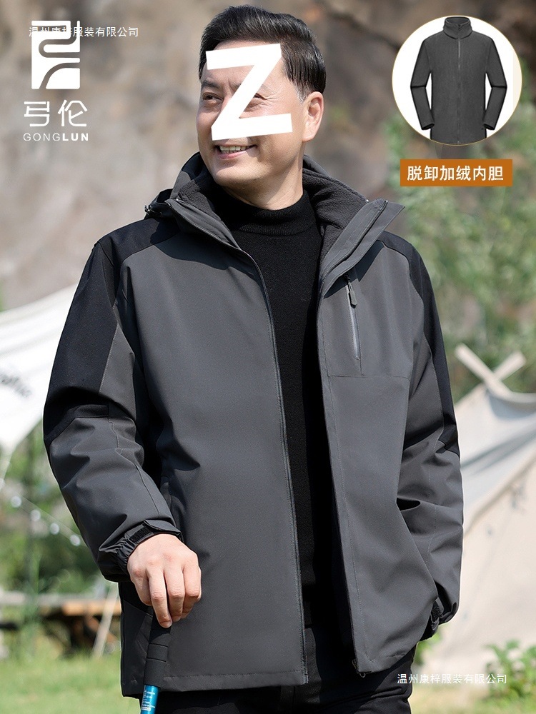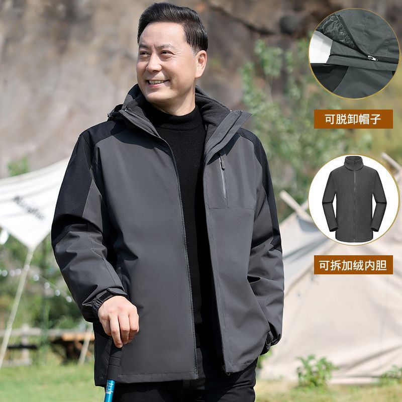 中年爸爸冲锋衣男加绒款可拆卸三合一爷爷上衣中老年人春秋装外套
