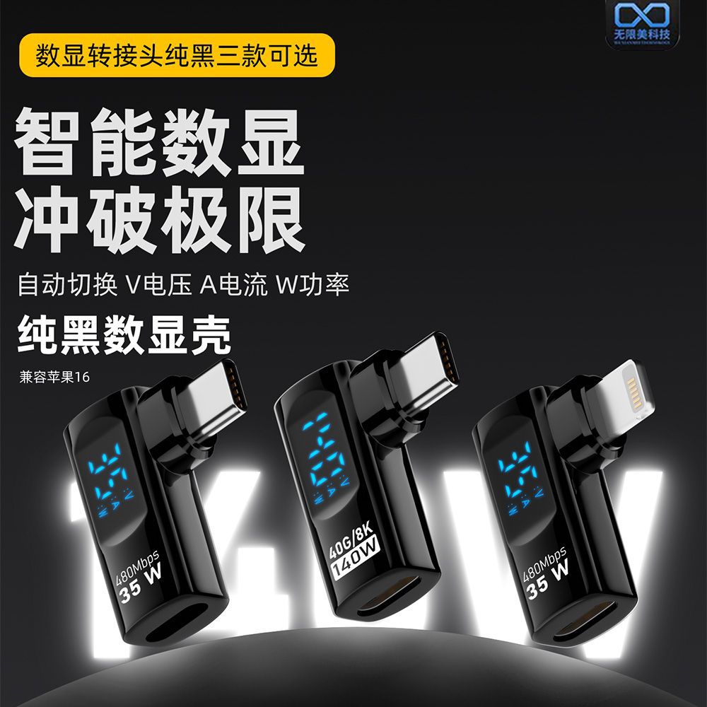 TypeCデジタル表示アダプタC公転Cメス140w急速充電双方向40g伝送8k 60hzスクリーン側曲げデジタル表示
