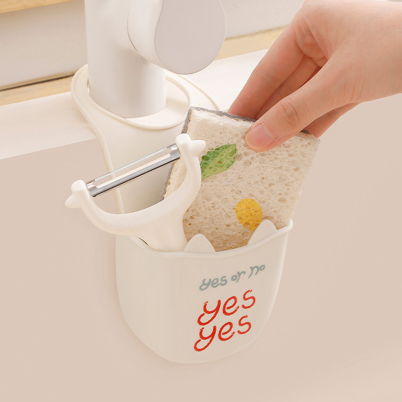 水槽の水たまりかごに袋を掛けて食器を洗うスポンジの蛇口を収納して物を置く棚の台所用品の池に穴を開けないでかごを掛けます。