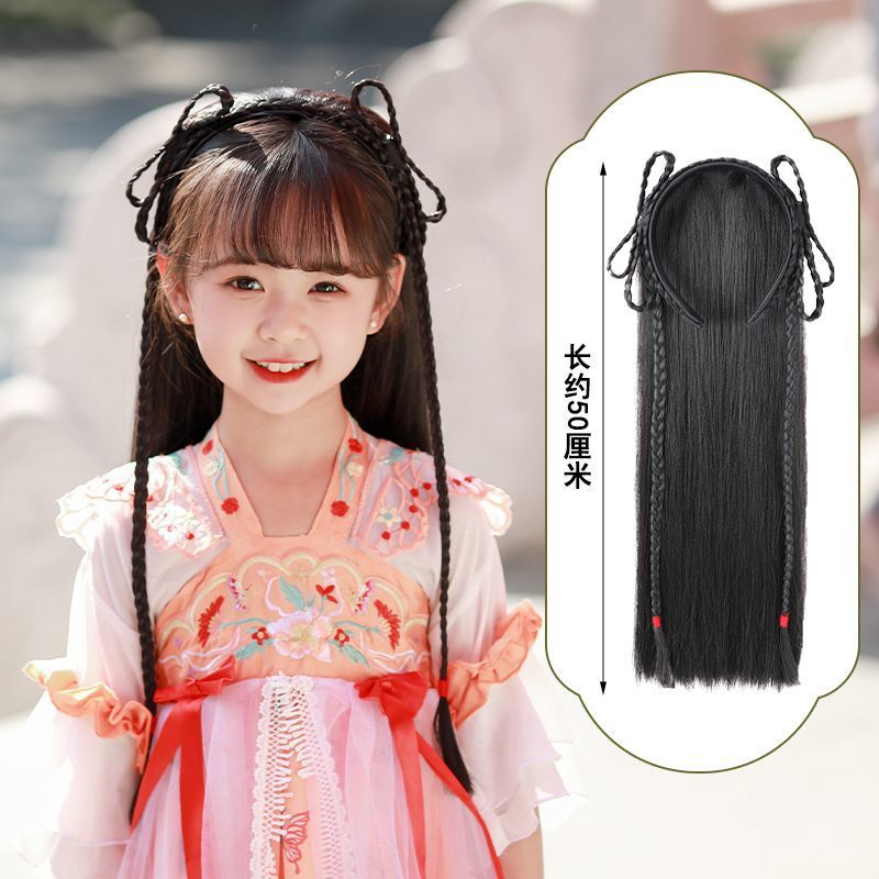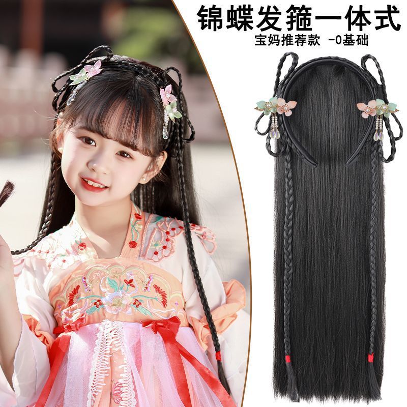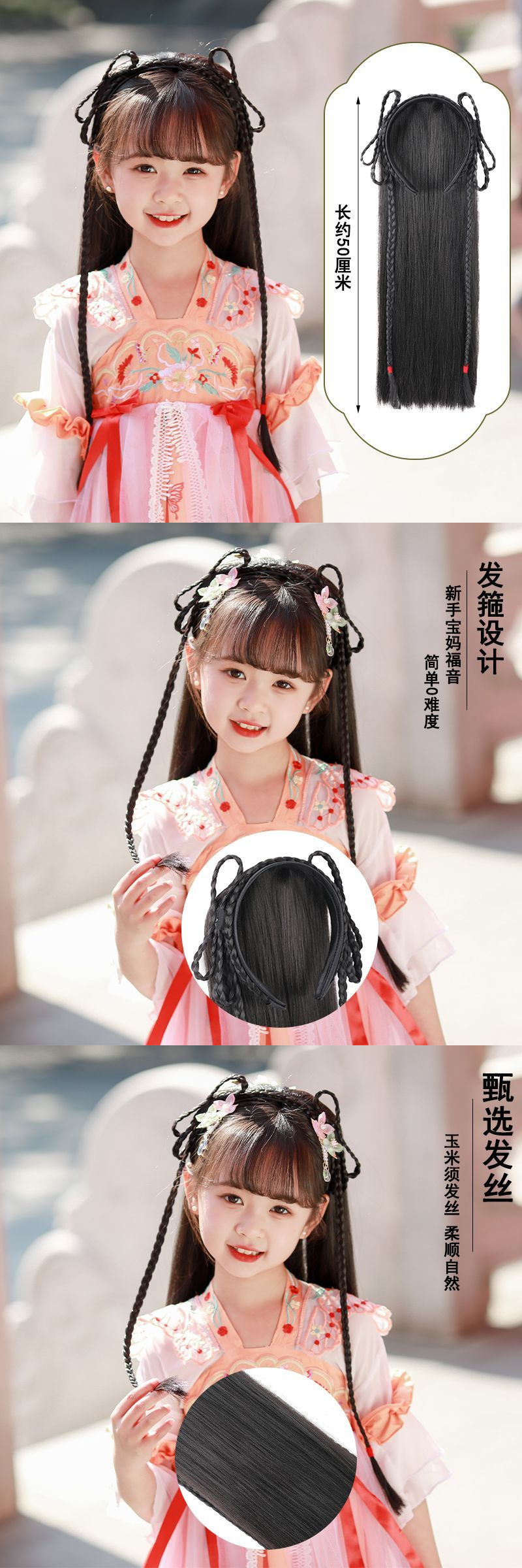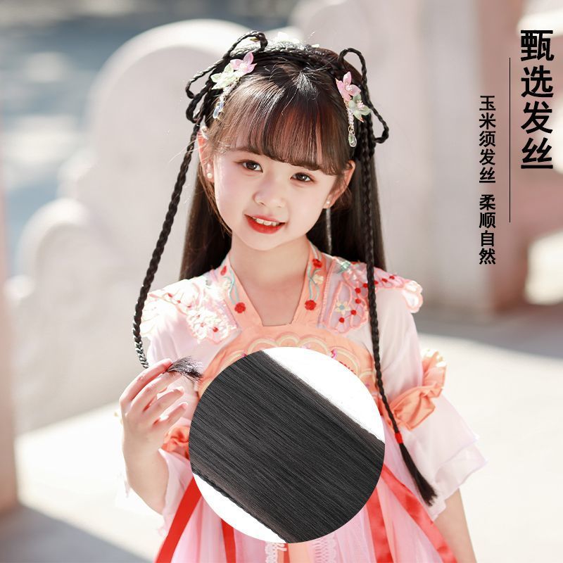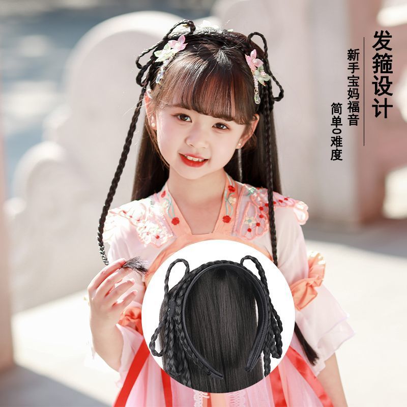 子供用漢服帽子、ウィッグバッグ、女の子用古代衣装オールインワンレイジーヘアフープ、古代スタイル、日常多用途三つ編みスタイル