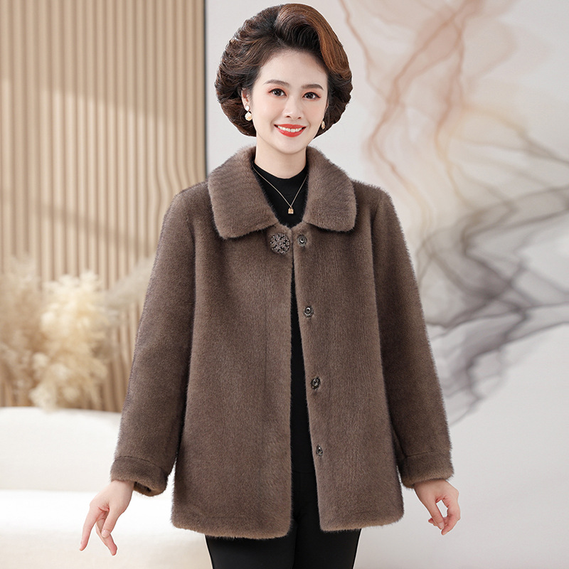 中年のお母さんの秋冬の新型のミンクの毛のコートの50歳の中高年の女性の冬の服の毛皮の一体の模造の毛皮のコート