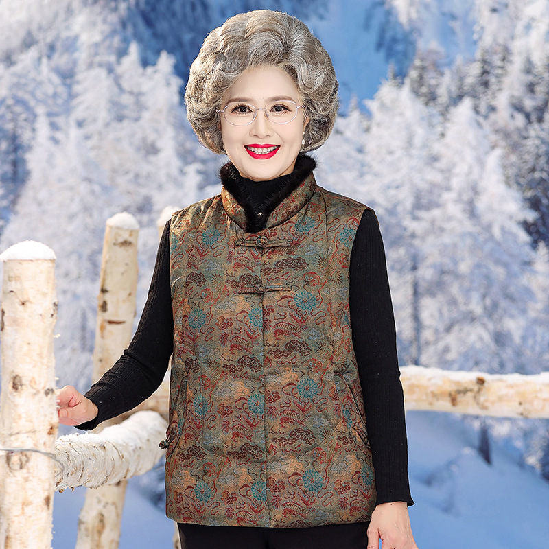 おばあさんのダウンベストの肩の中で高齢者の女性の中でコードの上着の馬甲のお母さんは厚い保温のコートを詰めます。