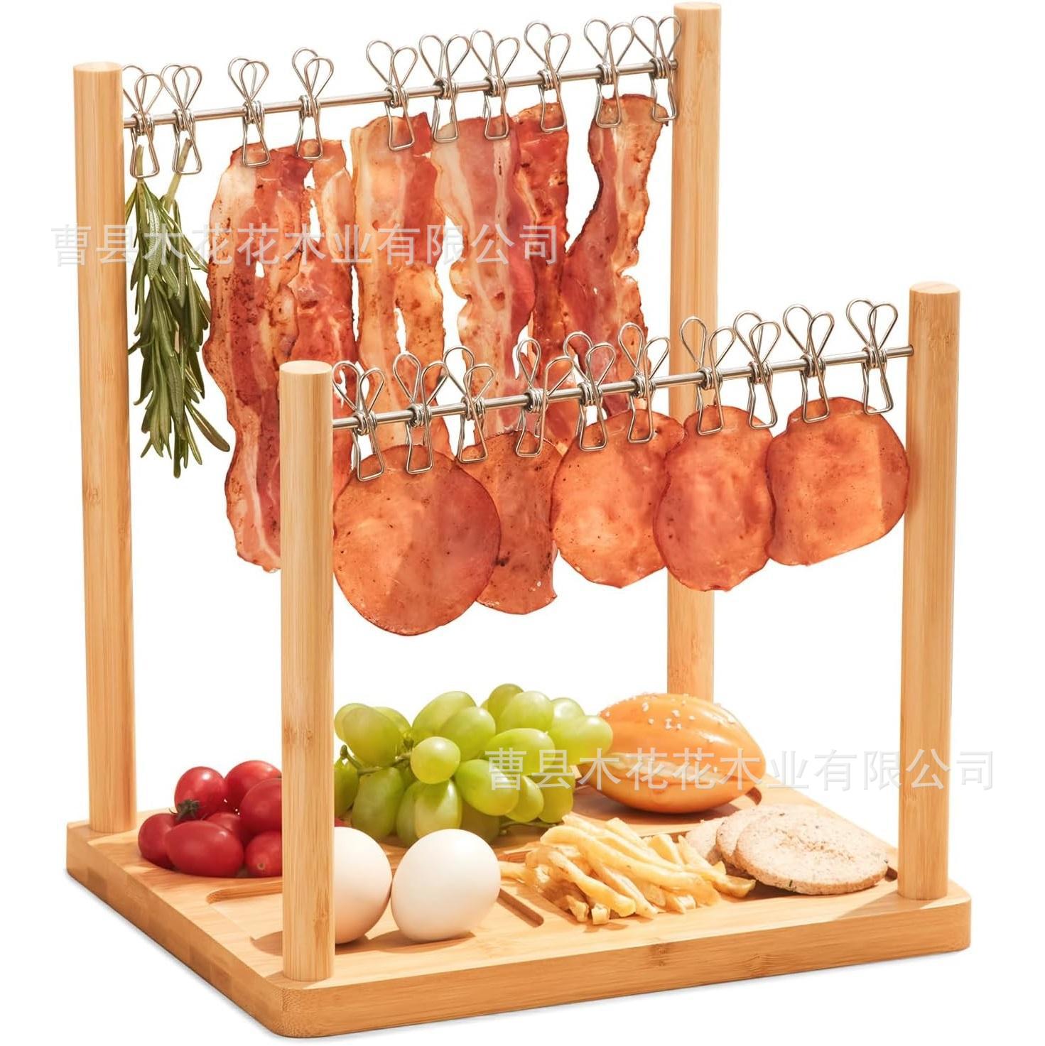 クリップ付き木製バーベキューラック、ディバイダーディップトレイ付きベーコンディスプレイラック、ホームパーティーバーベキューディスプレイラック