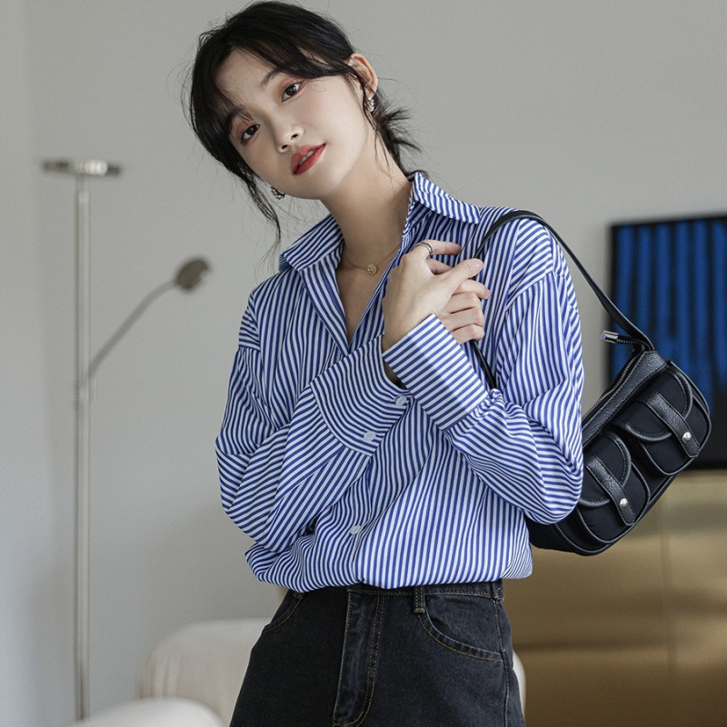 青いストライプの長袖のシャツの女性の早秋のデザイン感があります。