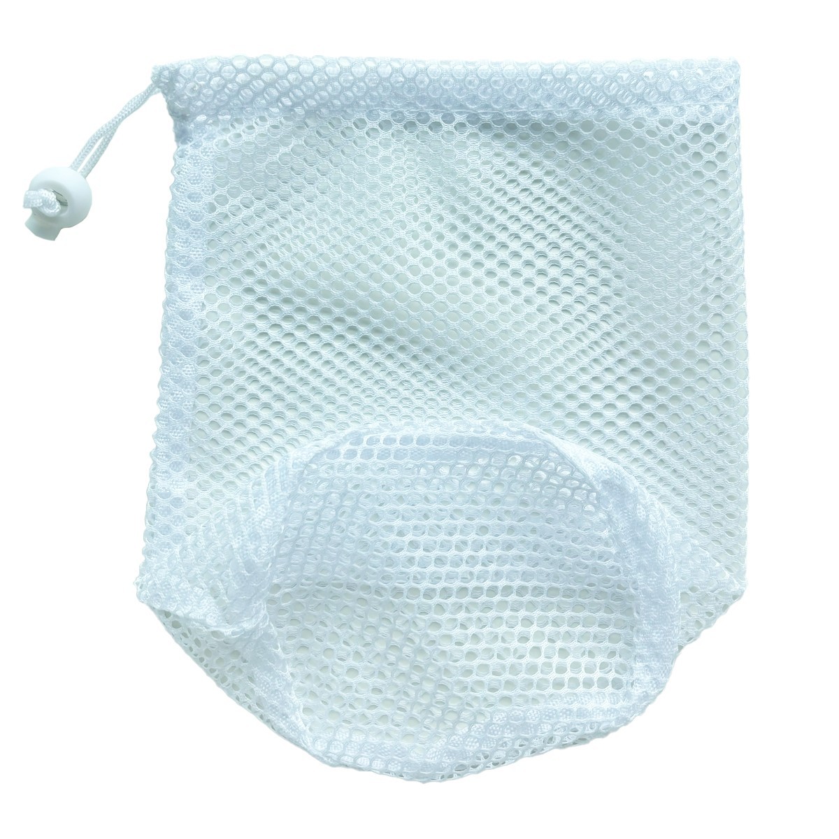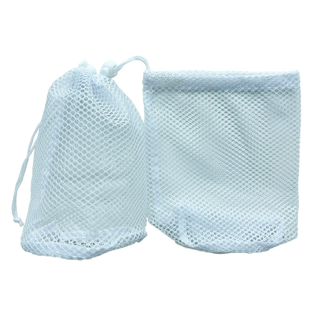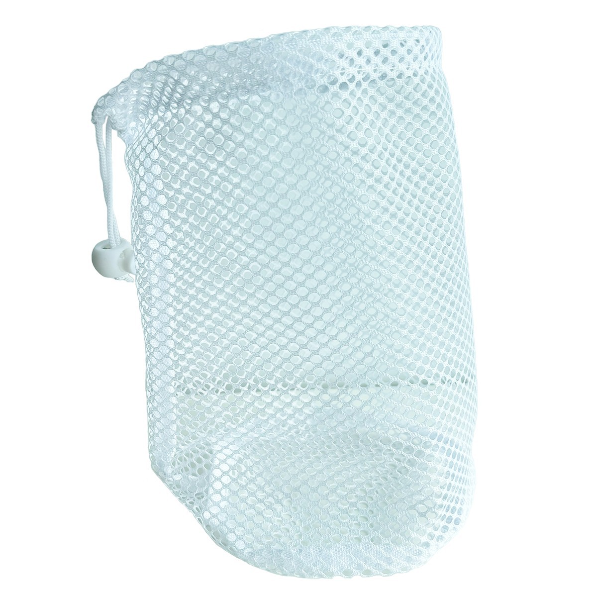 丸底の白いナイロンメッシュの巾着ゴムと伸縮性のあるボールバッグ、ロープロック付き、汚れた衣類の保管に使用できます。