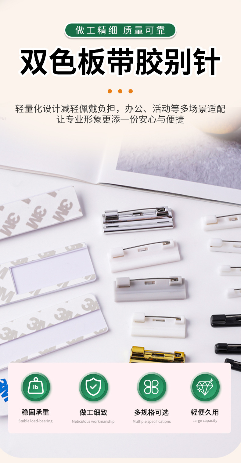 さまざまなサイズのプラスチック製の接着剤付きバッジ、工場番号プレートピン、安全バッジピンを備えたメーカー卸売 2 色プレートが在庫あり