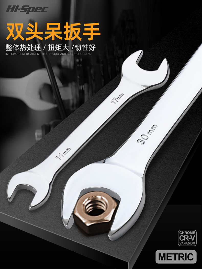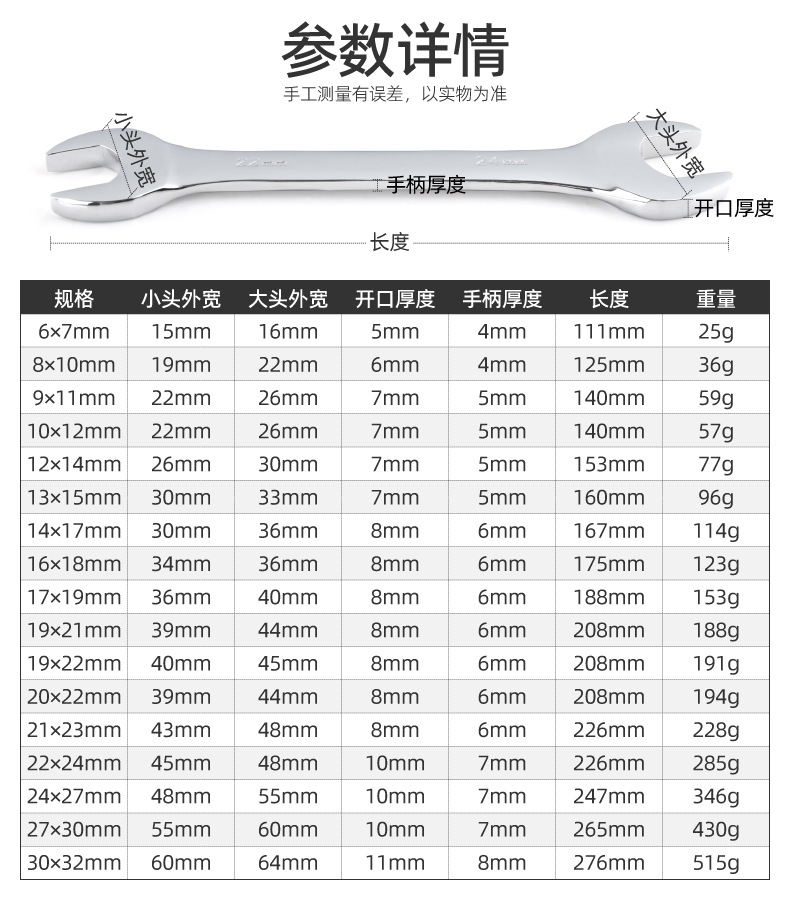 规格型号 双开口【6x7mm】,双开口【8x10mm】,双开口【9x11mm】,双开口【10x12mm】,双开口【12x14mm】,双开口【13x15mm】,双开口【14x17mm】,双开口【16x18mm】,双开口【17x19mm】,双开口【19x21mm】,双开口【19x22mm】,双开口【20x22mm】,双开口【21x23mm】,双开口【22x24mm】,双开口【24x27mm】,双开口【27x30mm】,双开口【30x32mm】,薄款扳手【6mm*7mm】,薄款扳手【8mm*9mm】,薄款扳手【8mm*10mm】,薄款扳手【10mm*11mm】,薄款扳手【10mm*12mm】,薄款扳手【12mm*13mm】,薄款扳手【12mm*14mm】,薄款扳手【14mm*15mm】,薄款扳手【14mm*17mm】,薄款扳手【16mm*17mm】,薄款扳手【17mm*19mm】,薄款扳手【18mm*19mm】,薄款扳手【19mm*22mm】,薄款扳手【20mm*21mm】,薄款扳手【22mm*24mm】,薄款扳手【24mm*27mm】,薄款扳手【30mm*32mm】