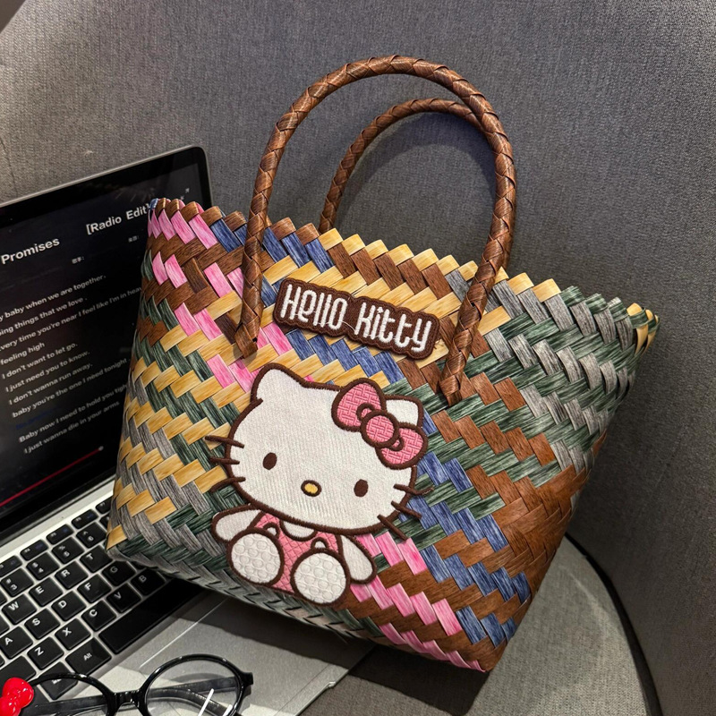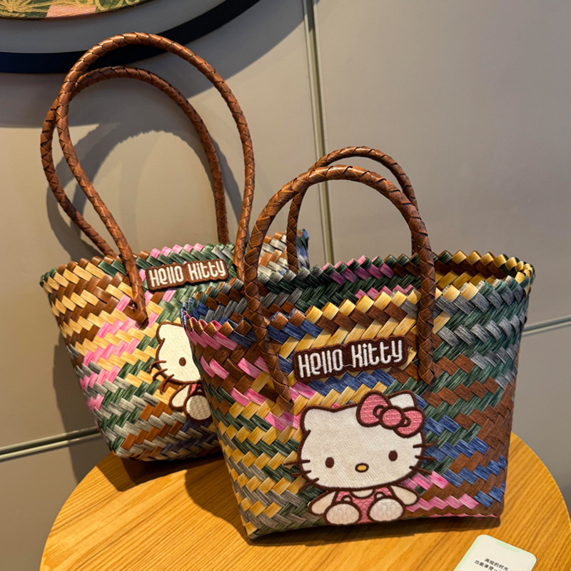 KT猫卡通仿藤编织菜篮子包野餐包手提单肩包大容量上班杂物小拎女