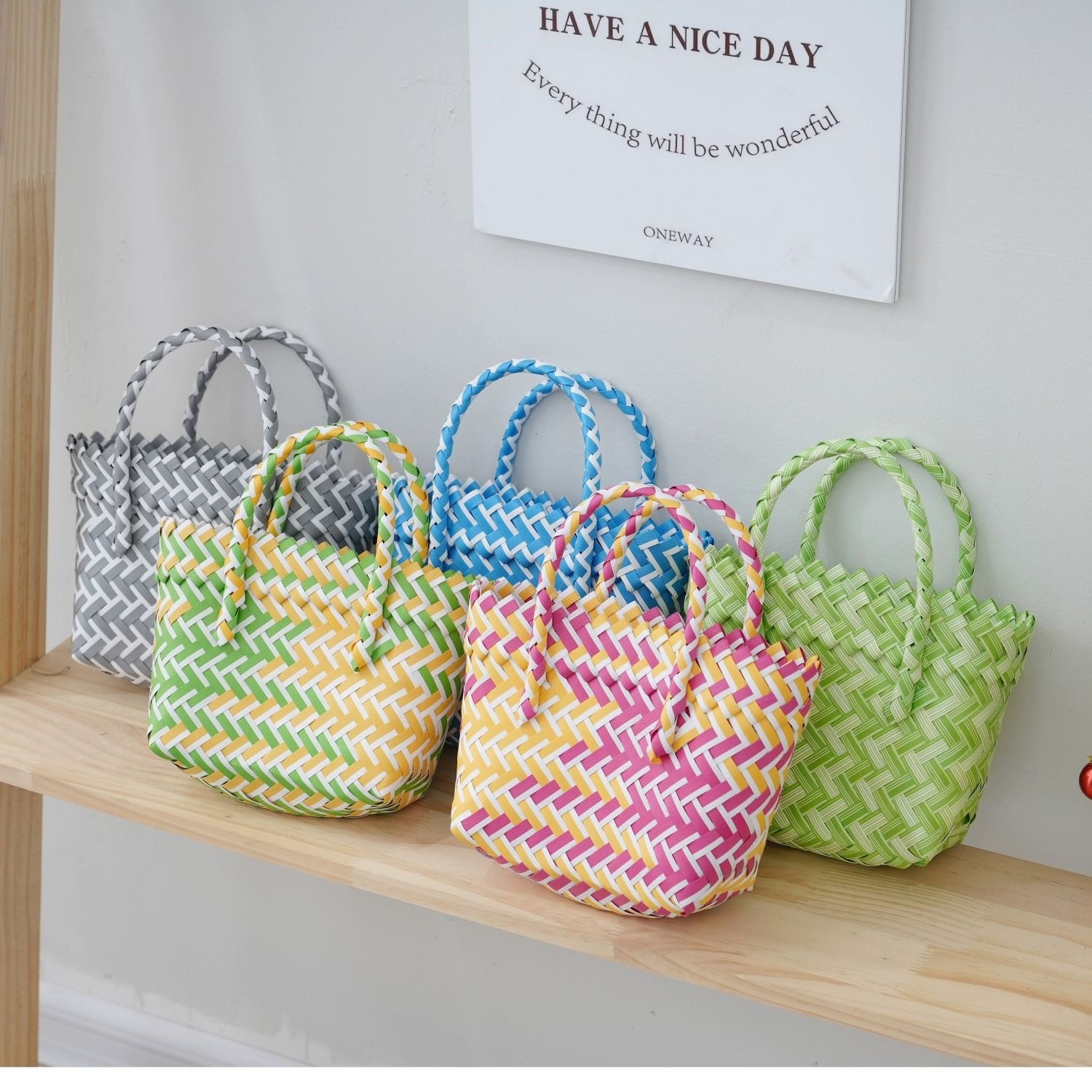 メーカーの新しいカラフルなプラスチック織りハンドバッグ、織りバスケットバッグ、トイレタリーハンドバスケット、ウェディングギフトバッグ