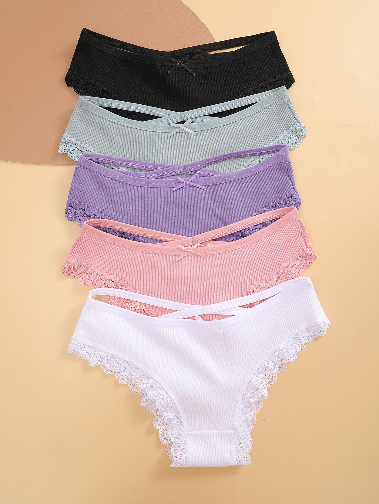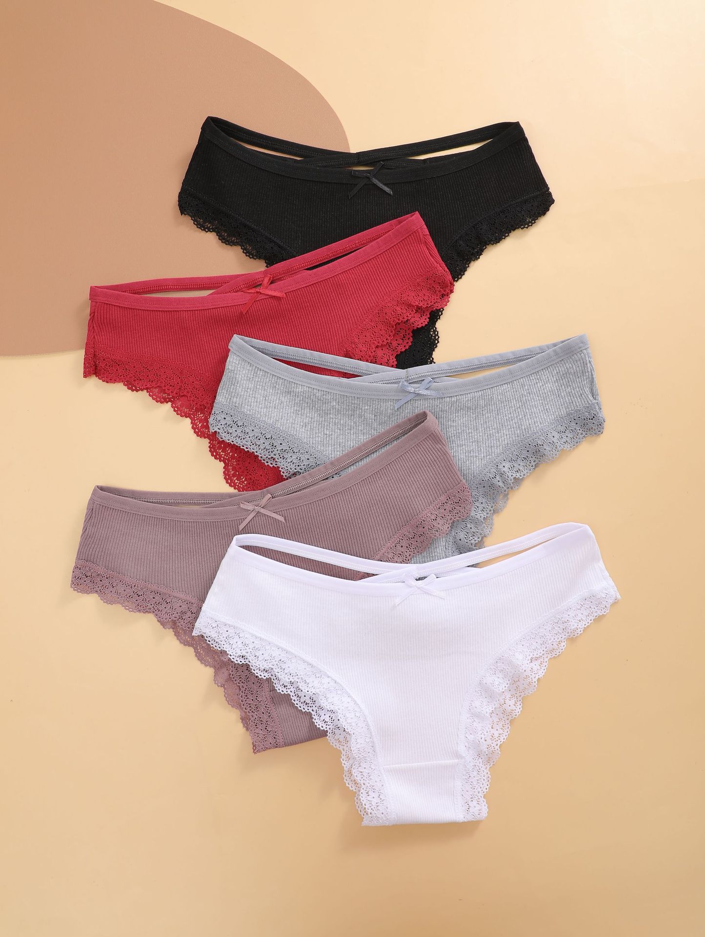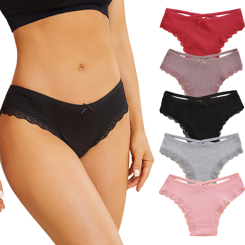 跨境亚马逊希音欧美螺纹内裤女纯棉中腰比基尼蝴蝶结花边少女内裤