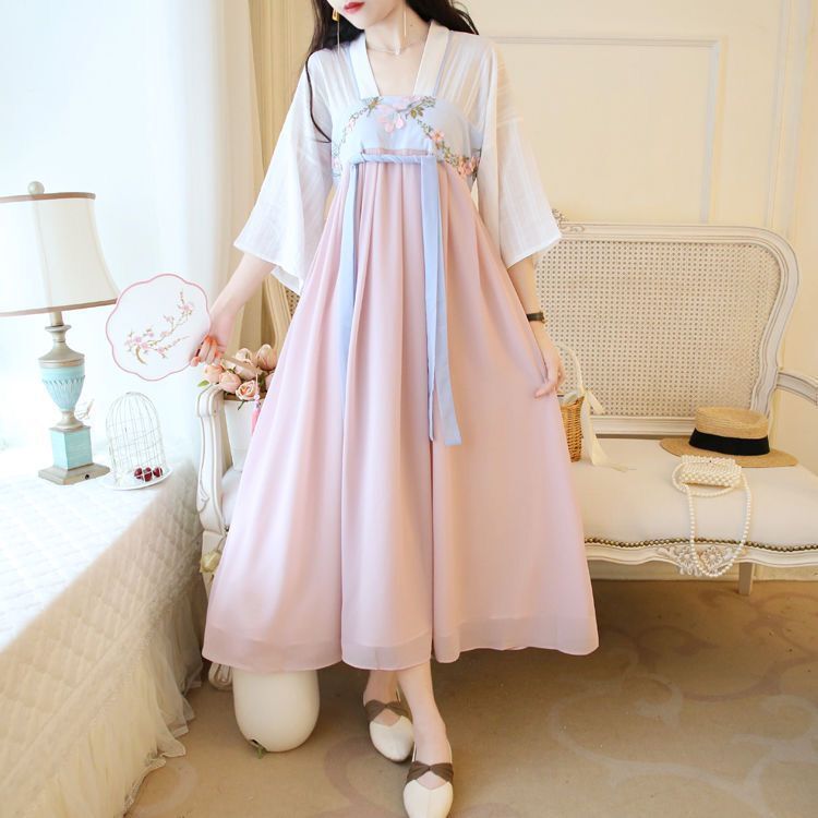 改良された漢服ドレス女性のサマースカート刺繍古代スタイルの妖精ハイウエストミッドスリーブシフォンミッドレングススカートストレートヘア