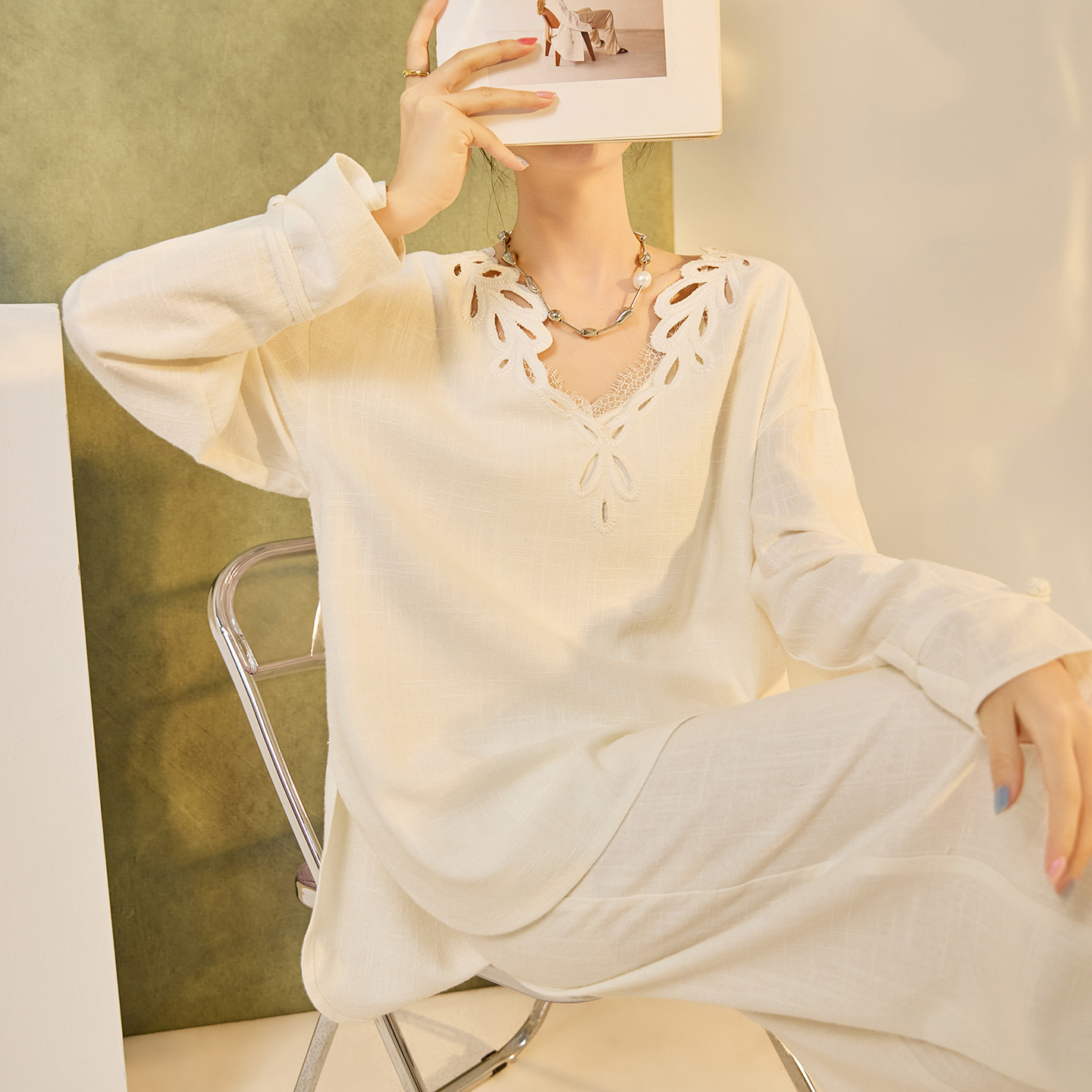 早秋新中式轻奢镂空刺绣度假风V领国风上衣长裤套装女 ZX款N7020