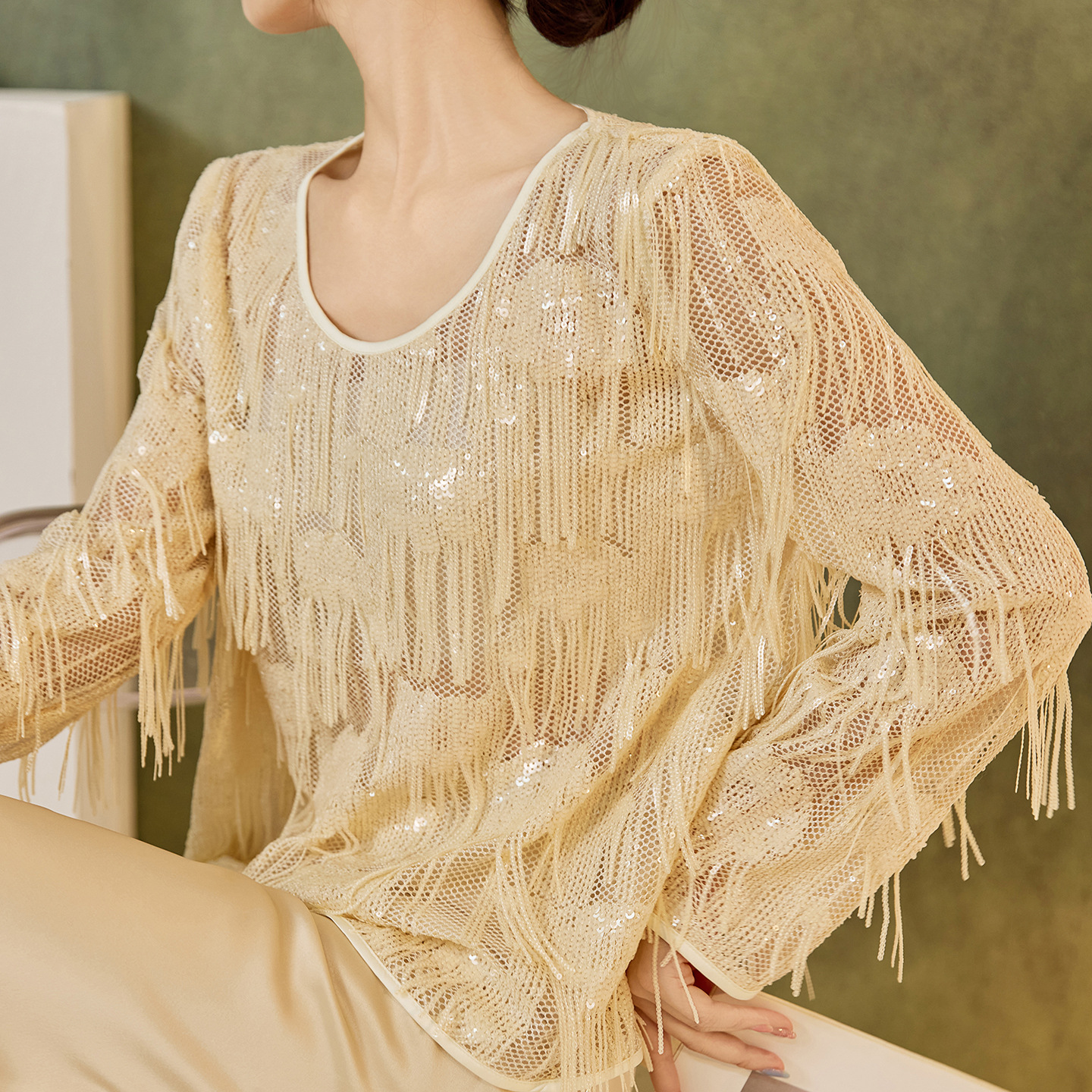 2025年秋新作 中華風 花柄刺繍 スパンコールシャツ オールドマネースタイル エレガント サテンブラウス M3003