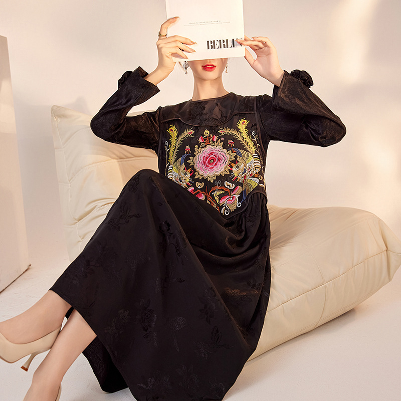 2024秋新中国式袖なし気質ロングスカート新国風刺繍プリント人糸ワンピース女性m 9007