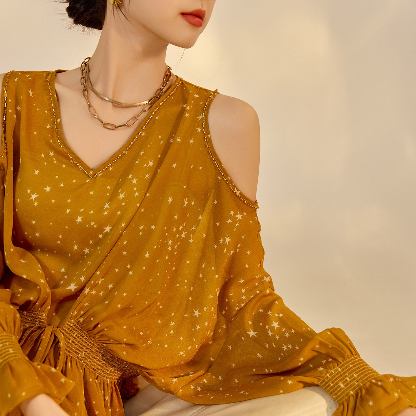 秋の星柄デザイン レトロVネック長袖高級感シャツワンピース ゆったりツーピースセット ZX型N5062