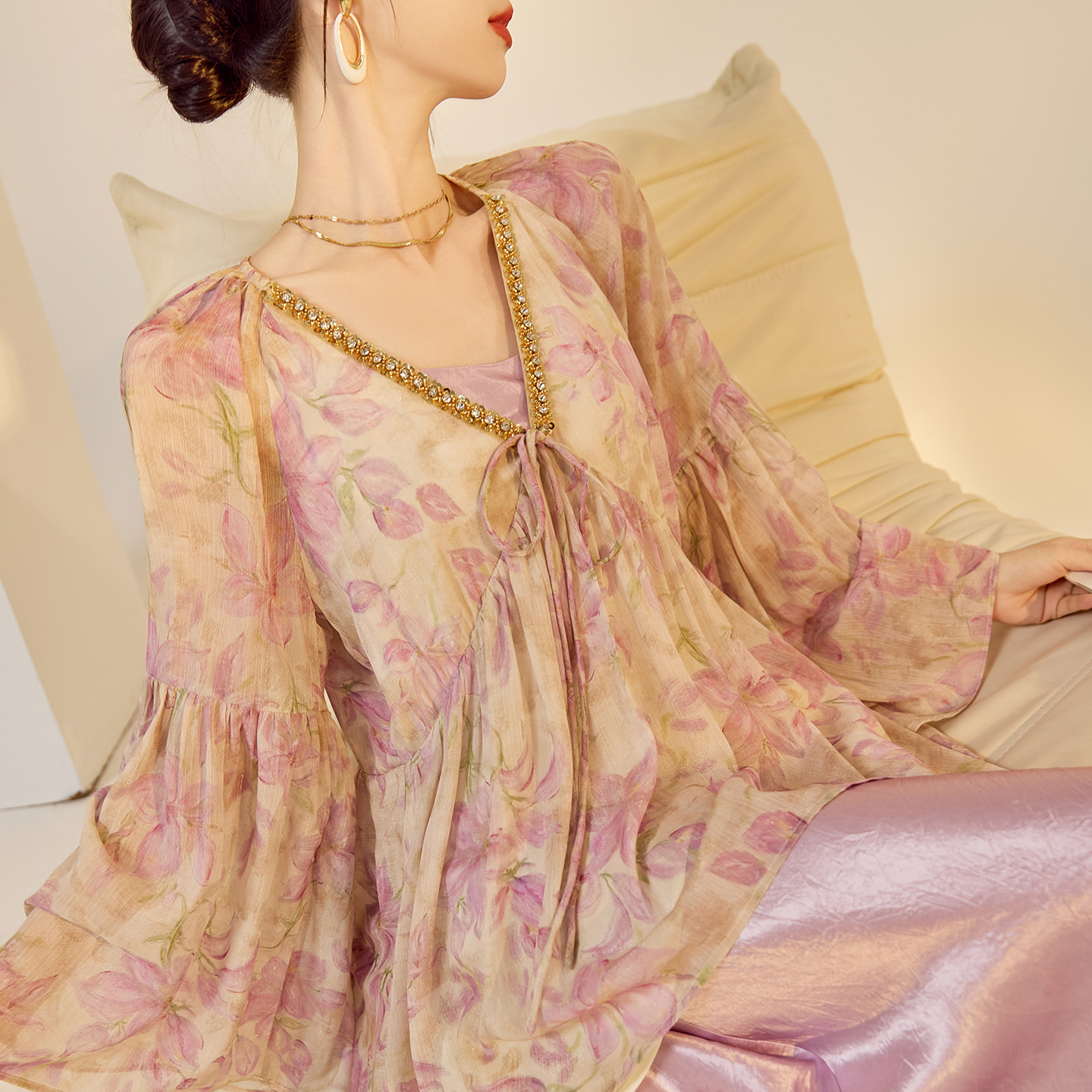 秋季新款国风V领灯笼袖雪纺衫女2025新中式镶钻设计上衣ZX款N6094