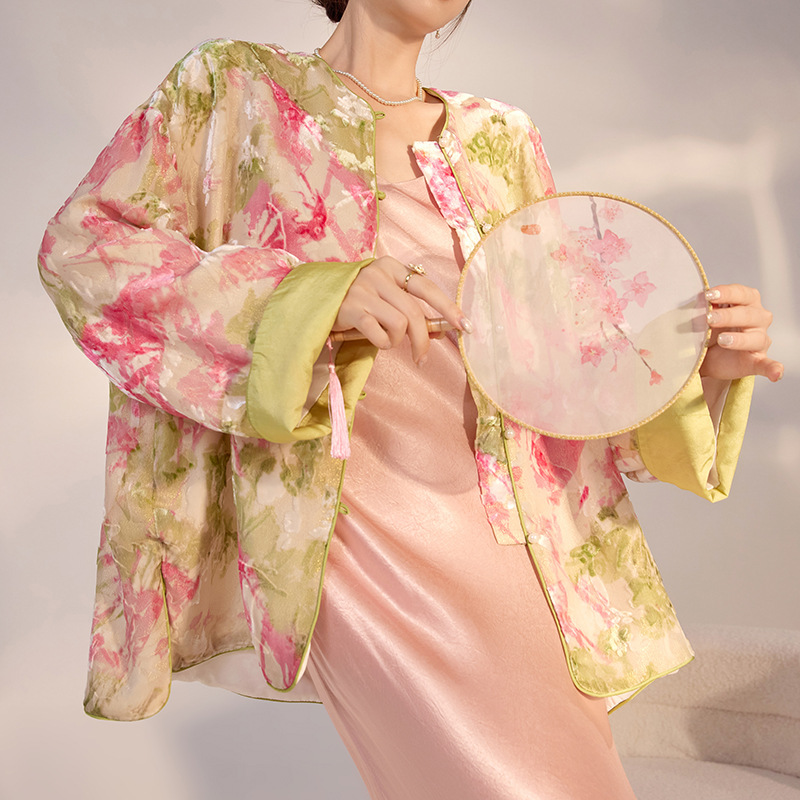 100% 绢糸新中国式国風色花プリント高級感シャツ軽贅沢気質上着m3106