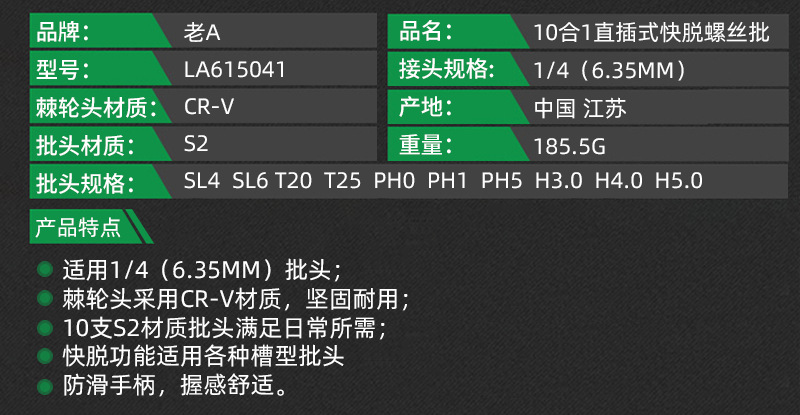 Old A クイックリリースドライバーセット プラグイン 10-in-1 ドライバーセット ラージハンドル磁気ドライバーセット